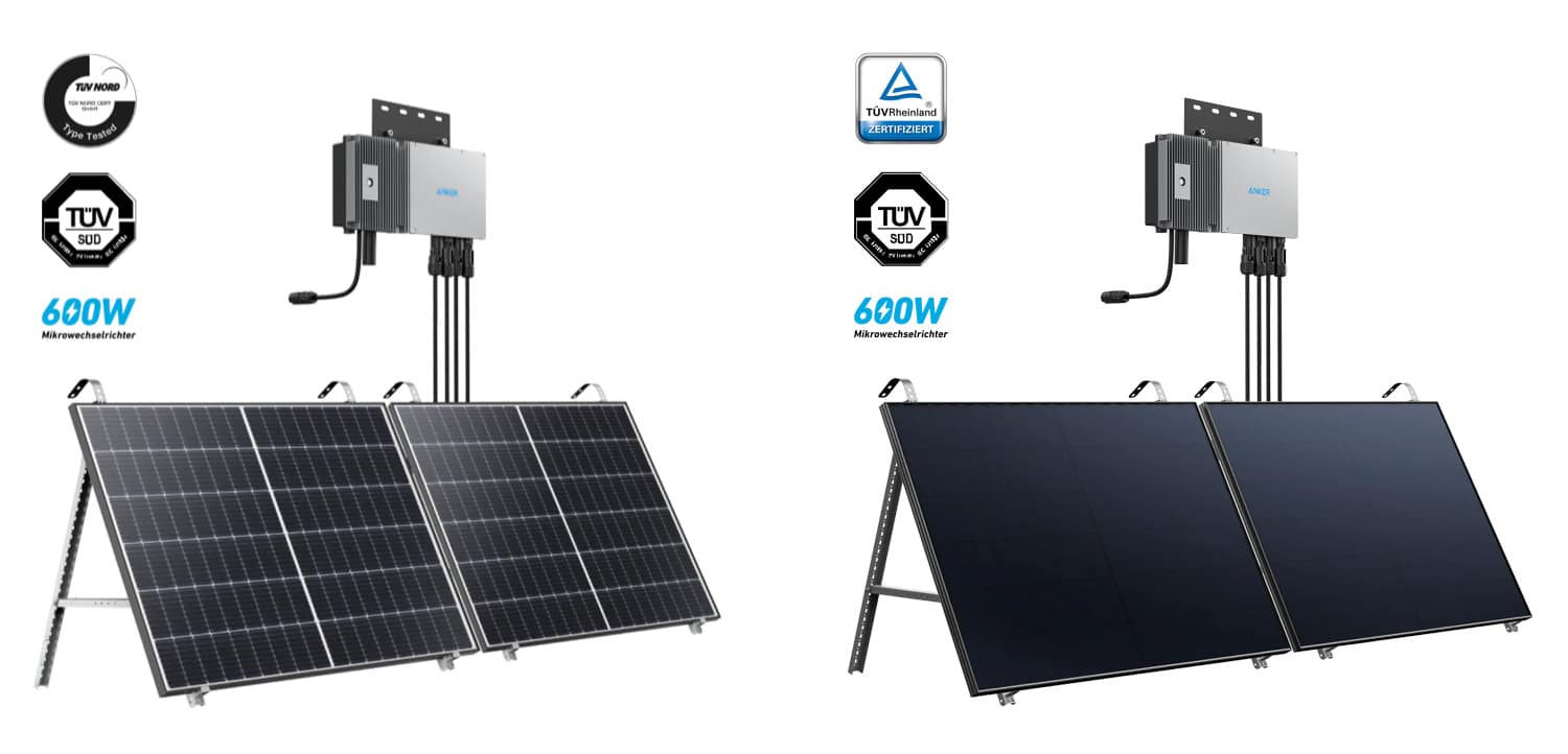 Das zweite angebotene Balkonkraftwerk ist das Anker SOLIX RS40P Balkonkraftwerk Set, dass 1389 € kostet. Hier bekommst du zwei optisch andere 440 Watt starke Solarpanele, ganze 30 Jahre Leistungsgarantie und wieder eine Stromeinspeisung von 600 Watt.