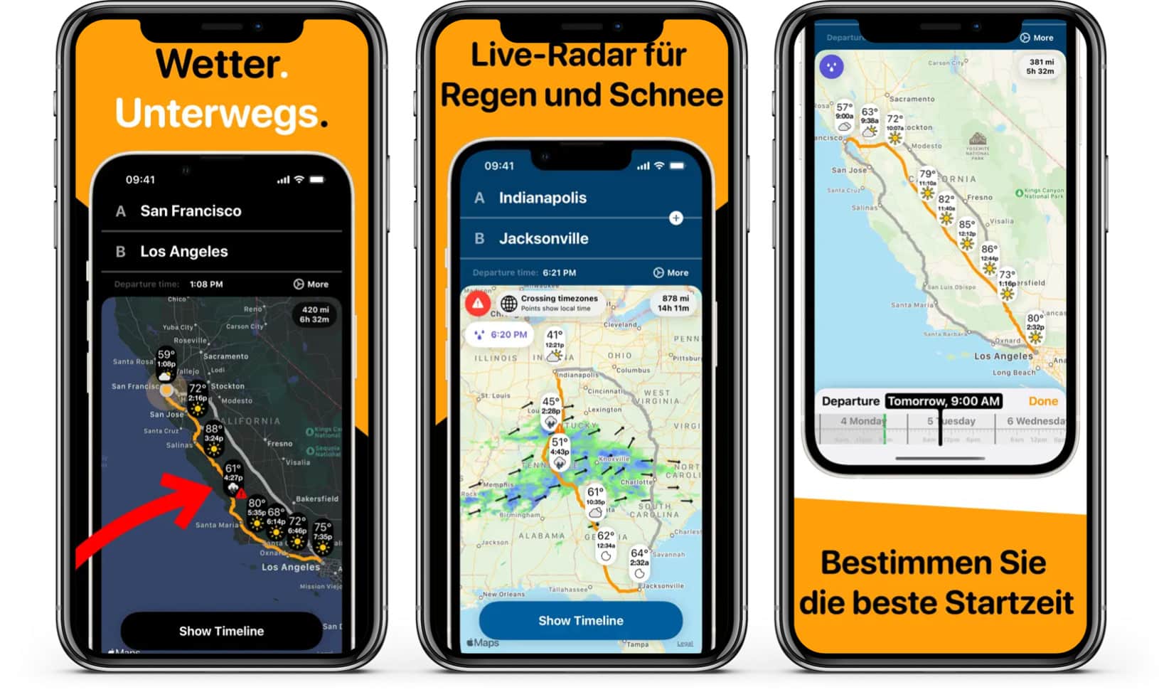 Die App „Routenplaner: Wetter unterwegs“ zeigt dir auf deiner geplanten Route genau an, wie das Wetter auf dieser für deinen geplanten Trip wird. Die App ist eine Kreuzung aus Navigationssystem und Wetterbericht und zeigt dir aktuelle Wetterinformationen an. So kannst du im vorn herein prüfen, ob etwa Schnee, Wind, Regen oder Glätte deinen Trip gefährden könnten. Das sogar ganze sieben Tage im Voraus.
