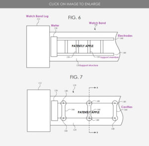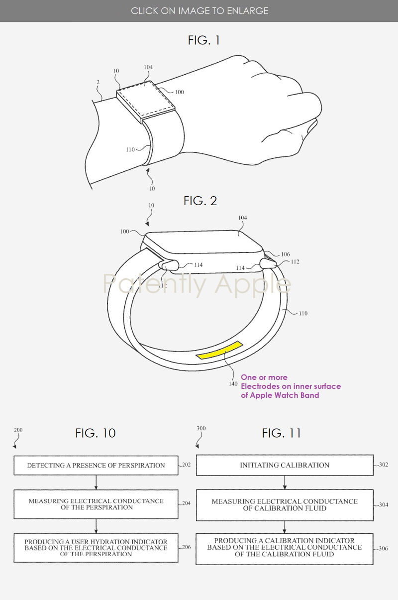 Die Flüssigkeitssensoren von Apple hingegen bestehen aus nicht-invasiven Elektroden, die auf der Haut platziert werden und als „zuverlässige und elegante Lösung“ bezeichnet werden. Der Sensor funktioniert, indem er die elektrischen Eigenschaften des Schweißes des Apple Watch-Trägers misst.
