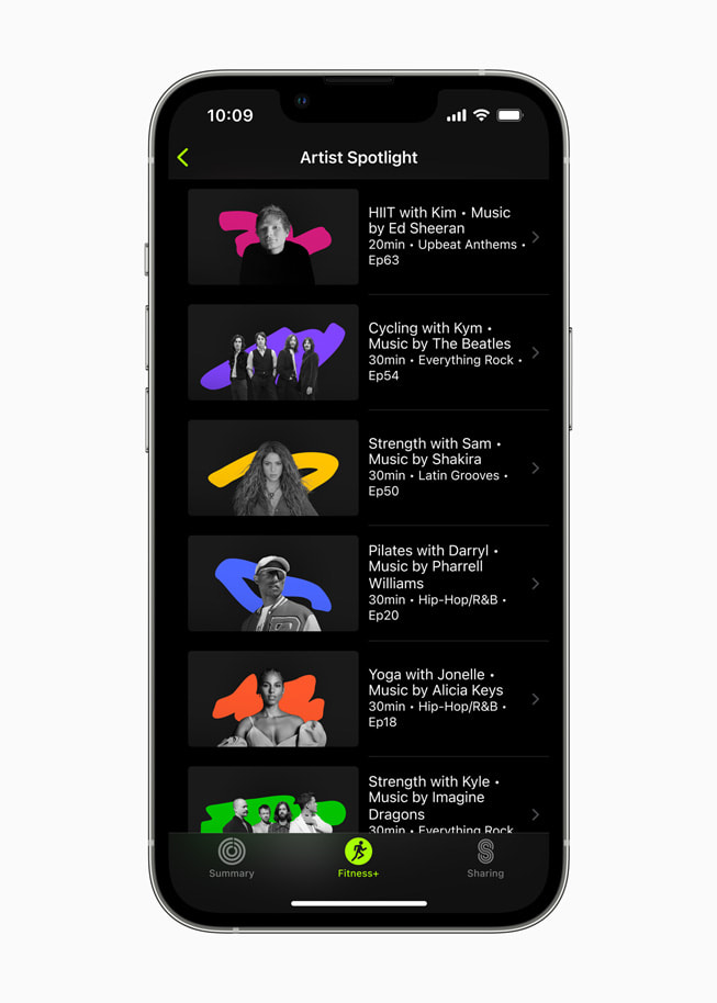 Darüber hinaus wird Fitness+ die beliebte Serie Künstlerinnen und Künstler im Spotlight um neue Trainings zur Musik von Ed Sheeran, Pharrell Williams, Shakira und den Beatles erweitern.