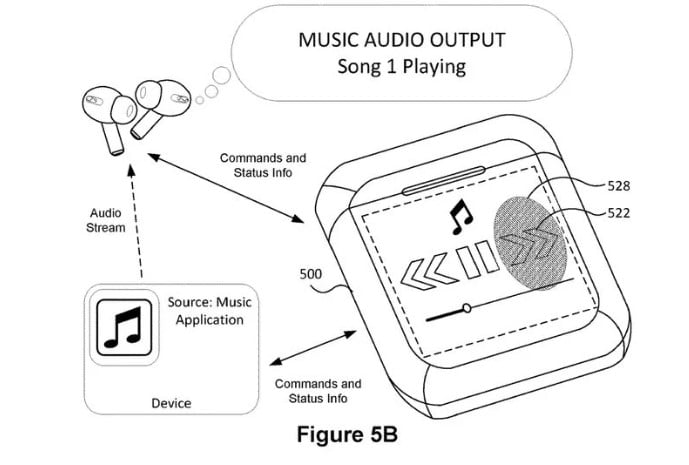 Darüber hinaus wird in diesem Dokument erläutert, dass die Steuerung von Apple Music über das Gehäuse unter Verwendung eines kapazitiven Touchscreens mit grafischer Benutzeroberfläche erfolgen kann. Das Gehäuse soll auch eine taktile Rückmeldung geben und so dem Benutzer ermöglichen, die Audiowiedergabe zu steuern, die Lautstärke einzustellen, Lieder zu favorisieren und mit Musik zu interagieren, ohne auf den Touchscreen zu schauen.