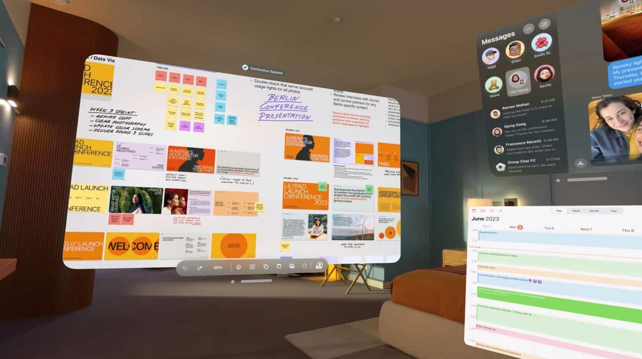 Das Betriebssystem nennt sich visionOS. Das Headset erstellt einen digitalen Avatar, der menschlich und realistisch aussieht und nicht wie ein Memoji. Microsoft Teams und Zoom sind bereits für visionOS optimiert. Apple verspricht, dass zum Launch auch tausende Apps von iPad und Mac verfügbar sein werden. Eine biometrische Sicherheitsmethode namens Optic ID ähnlich wie Touch ID und Face ID wird es auch geben.
