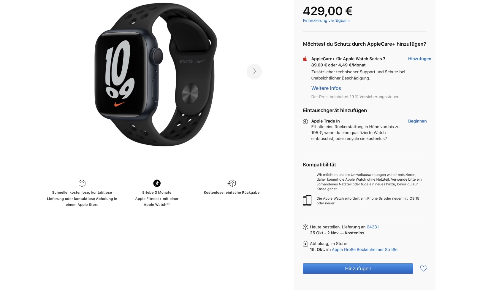 Aber im Gegensatz zu Amazon kann man bei Apple auch eine Abholung auswählen. Wobei auch diese Variante chaotisch ablief, denn zunächst wurde der 15. Oktober als Abholdatum angezeigt, aber die Apple Stores waren alle augegraut. Als diese dann verfügbar waren, hatte sich das Datum bereits in den November geschoben. Wenn man jetzt im Online-Store von Apple schaut, bleibt es bei Anfang/Mitte November bzw. für einzelne Modelle ist auch der 15. Oktober verfügbar. Kleiner Tipp unsererseits: wer unbedingt am 15. Oktober eine Watch Series 7 in den Händen halten möchte, der sollte sich die Nike-Edition anschauen, denn diese ist bei verschiedenen Apple Stores wie beispielsweise Oberhausen, Köln oder Frankfurt an diesem Tag abholbereit. Und außer einem kleinen Nike-Zeichen auf der Rückseite des Gehäuses, eine anderen Verpackung und des Armbandes, das man eh wechseln kann, unterscheidet sie sich nicht von der „normalen“ Version.