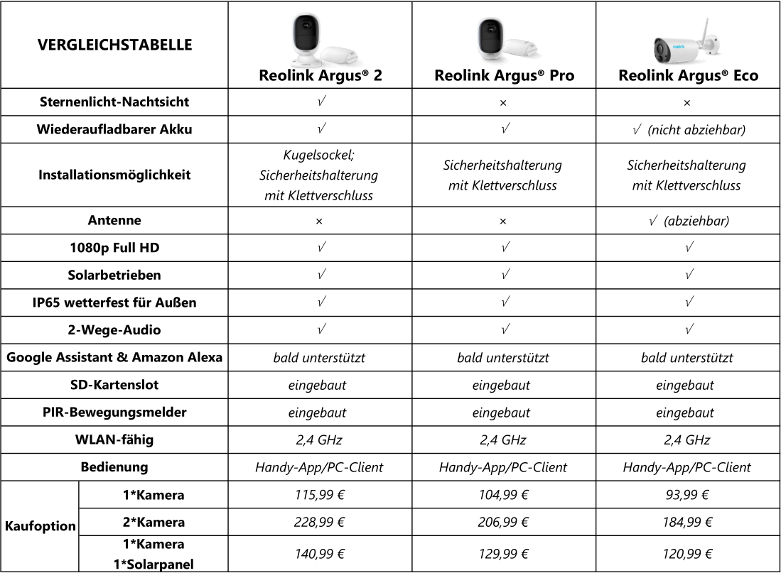 Neben dem Design, siedelt sich die Argus Eco am unteren Ende der Serie an und ist damit auch das günstigste Modell der Reihe. Das bedeutet aber nicht, dass sie schlechter ist, als es die Argus 2 oder Pro ist. Man muss schlicht auf 2 Features verzichten. So besitzt sie keinen austauschbaren Akku und hat auch keinen Sternenlicht-Nachtsicht Modus.
