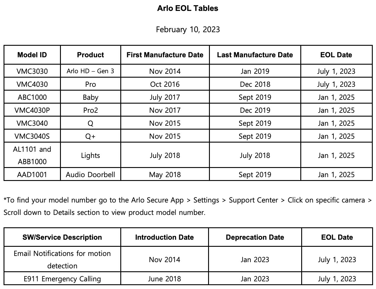 Arlo ändert EOL-Daten