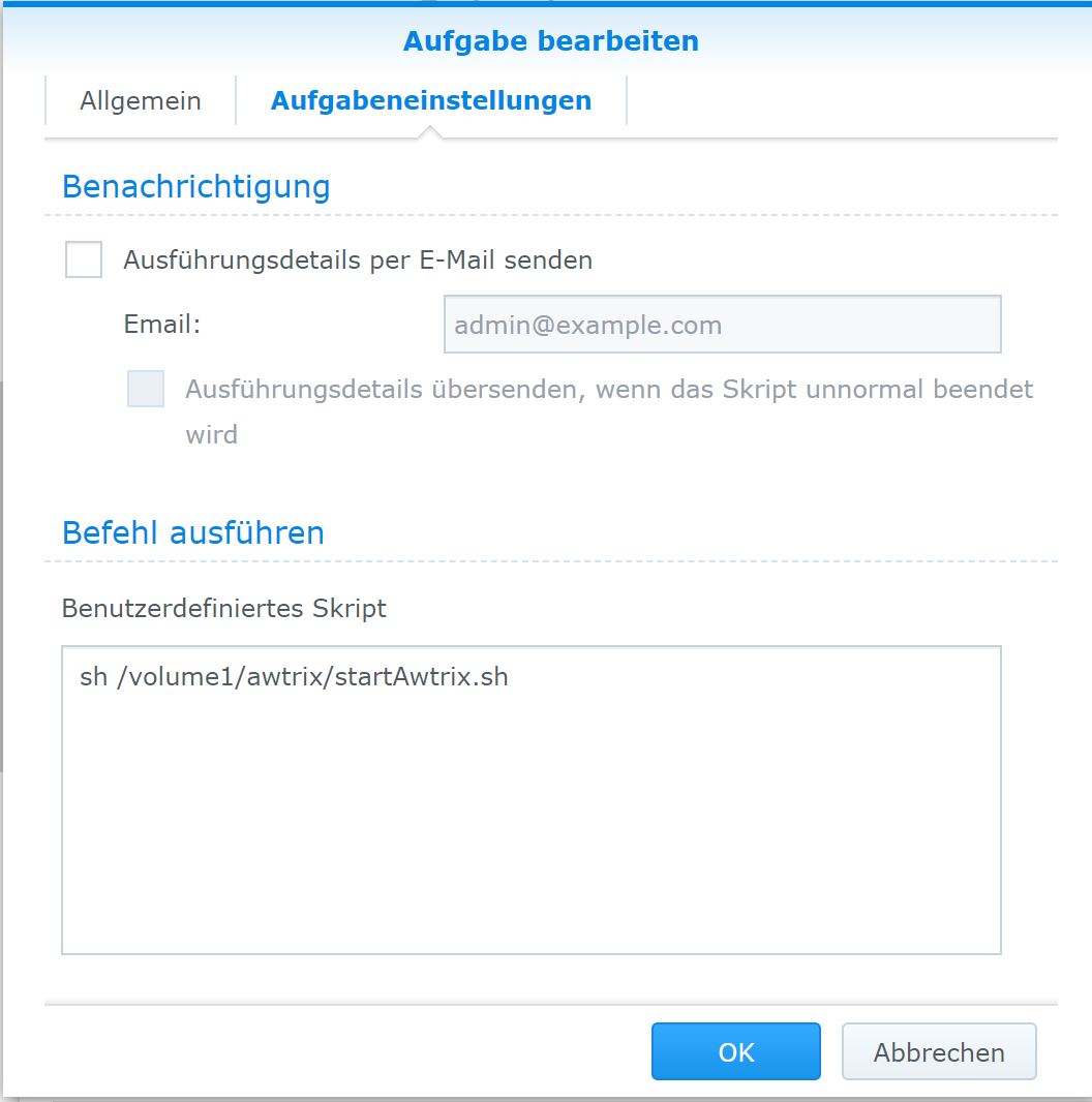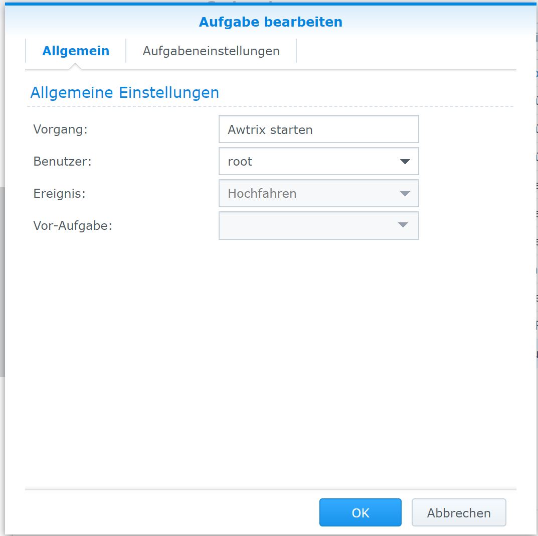 Jetzt musst du nur noch im Aufgabenplaner der Synology eine neue Aufgabe erstellen, die diese Datei beim Start der Synology ausführt. Das sieht dann so aus: