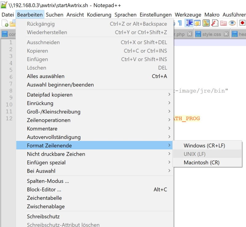 Solltest du andere Pfade verwenden, dann musst du die Variablen im Startscript entsprechend anpassen. Beim Speichern der Datei muss man nur darauf achten, dass die Zeilenenden als Unix Format codiert sind. Mit Notepad++ sieht das so aus: