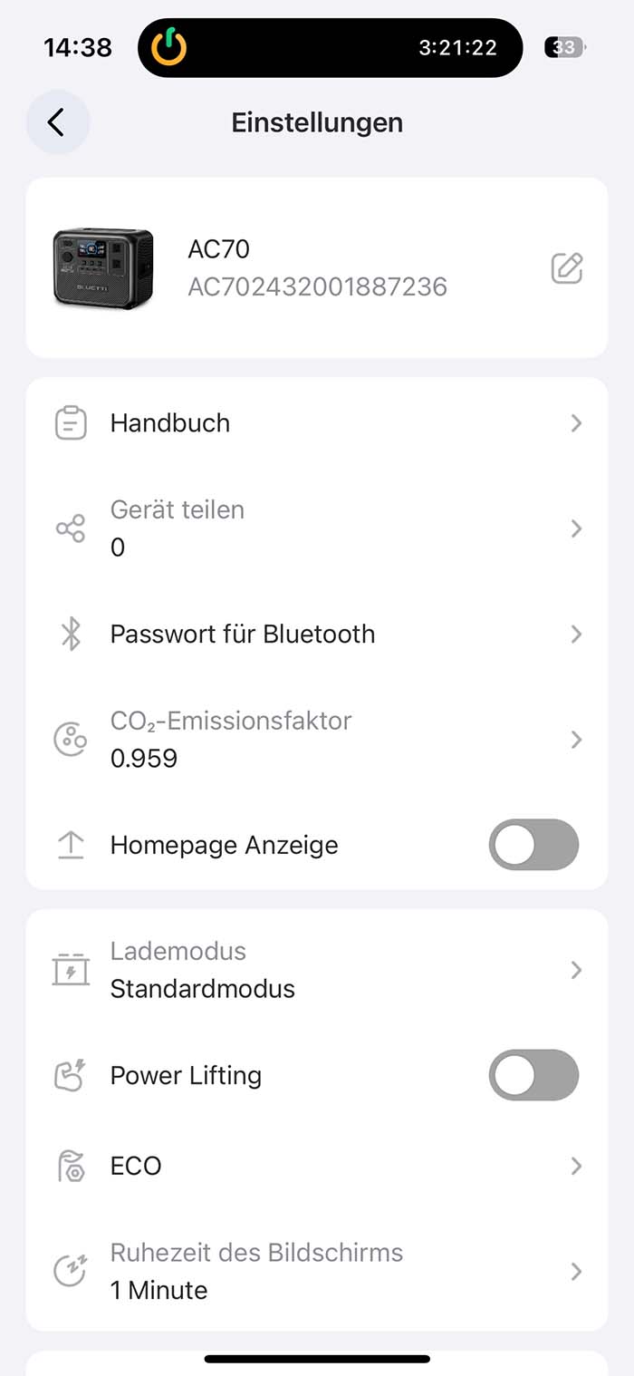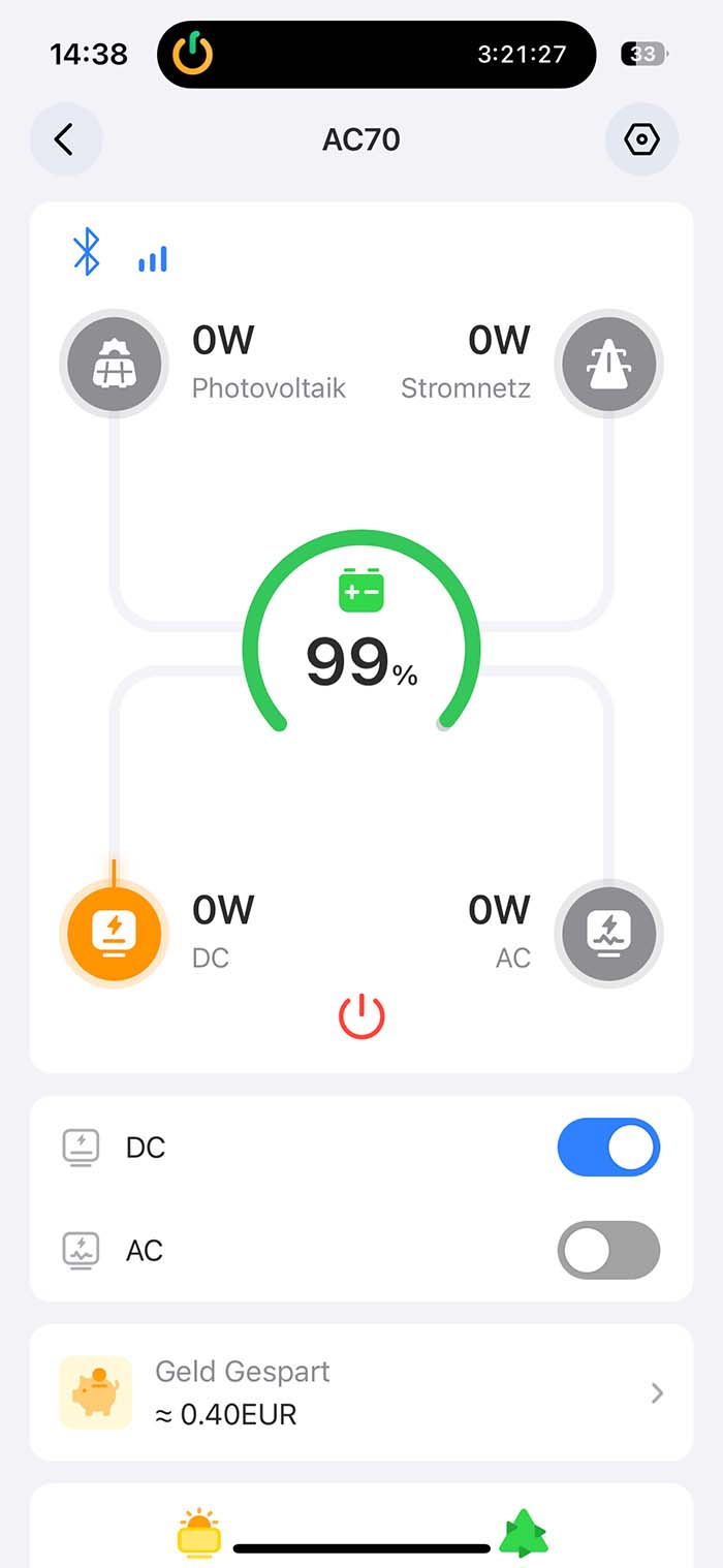 Die Power Station lässt sich auch mit der BLUETTI-App verbinden, allerdings nur über Bluetooth und nicht über ein integriertes WLAN-Modul. Eine Steuerung der Ausgänge aus der Ferne ist dementsprechend nicht möglich. In der App sieht man den aktuellen Status der AC70, kann die Eingänge ein- und ausschalten und natürlich auch den Zustand des Akkus einsehen. Daneben kann man sich auch den durch Fotovoltaik eingesparten Betrag anzeigen lassen, sollte man ein Solarpanel verwenden.