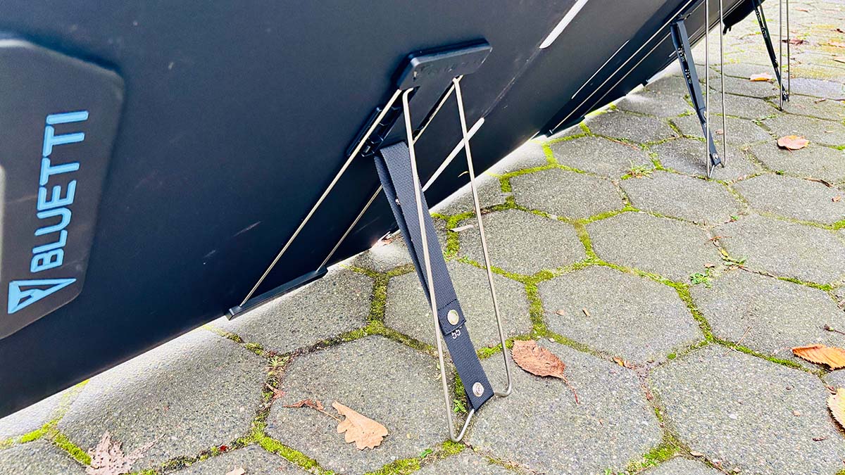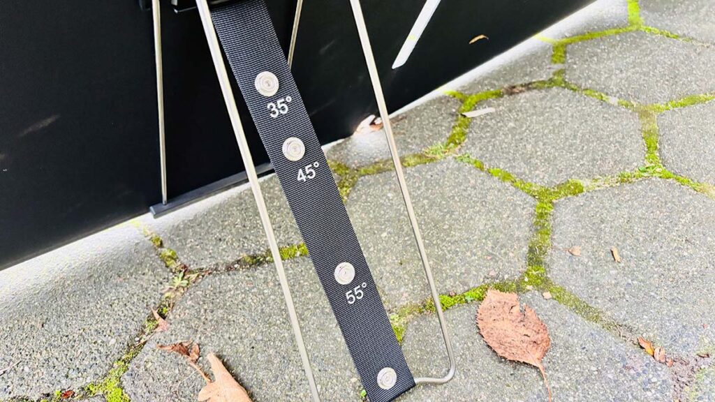 Bei der Aufstellung kann man die Neigung der Panels anpassen, damit je nach Sonnenstand die beste Energieausbeute erfolgen kann. Auf der Rückseite kann man die Standfüße dazu mit Druckknöpfen in verschiedene Positionen bringen und die Panels so mit 35, 45 oder 55 Grad anwinkeln. Ist der Untergrund uneben oder sehr weich, kann die Aufstellung etwas fummelig sein.