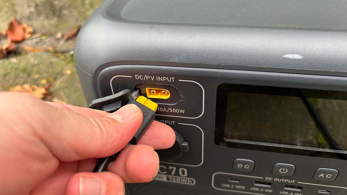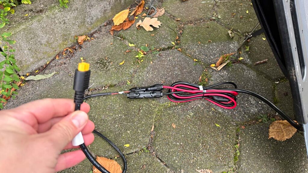 In meinem Fall habe ich das MP200 mit einer BLUETTI AC70 Power Station verwendet, da diese ebenfalls besonders kompakt und somit mobil einsetzbar ist. Da der Eingang für ein Solarpanel hier ein XT60 Anschluss ist, habe ich das der Power Station beiliegende XT60 auf MC4 Adapterkabel verwendet, um das Panel an die Power Station anzuschließen.