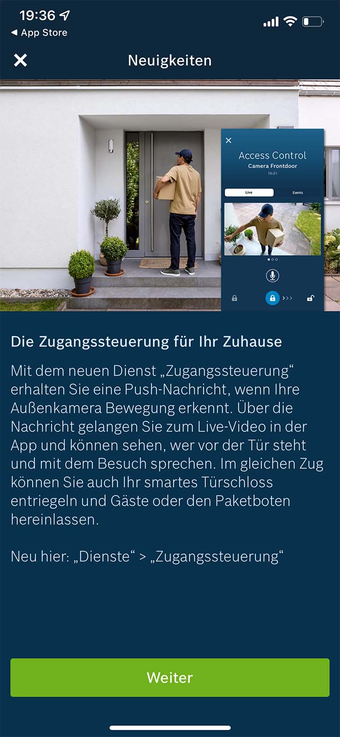 Mit dem neuen Dienst „Zugangssteuerung“ erhalten Nutzer eine Push-Nachricht, sobald eine Außenkamera eine Bewegung erkennt und können daraufhin entscheiden, ob sie ihr smartes Türschloss für den Besucher öffnen oder nicht. In der neuen Tab Bar findet man die fünf wichtigsten Navigationspunkte übersichtlich am unteren Rand der App.