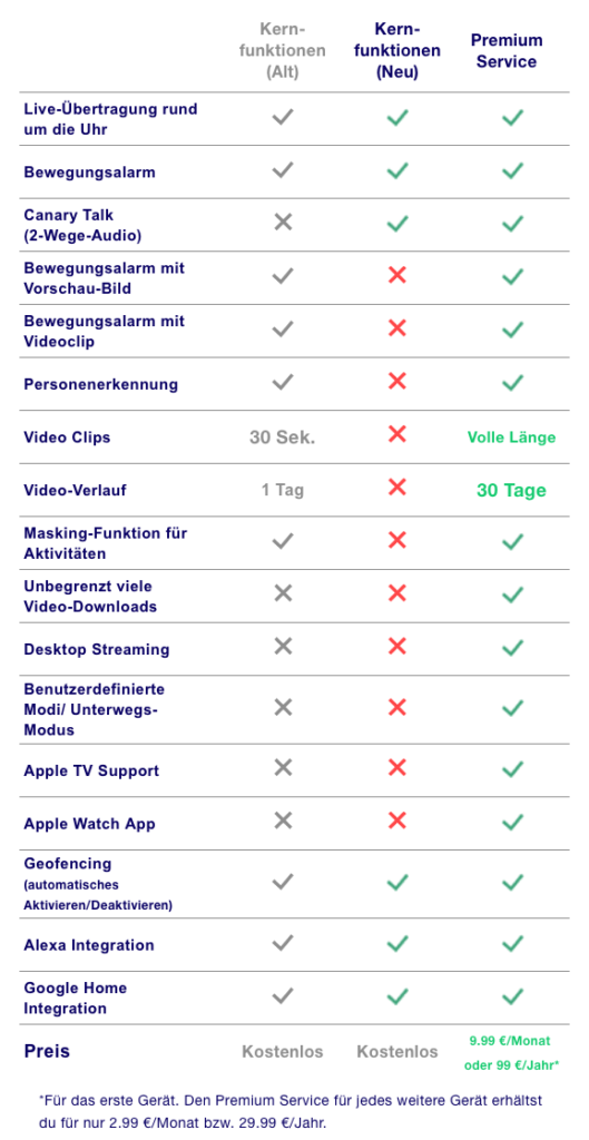 Das Unternehmen Canary, Hersteller von smarten Überwachungskameras, hat heute seine Kunden per Mail darüber informiert, dass sich der Umfang der Servicepläne ändert. Konkret fallen viele Funktionen des kostenlosen Basic Service Plans weg und werden in das kostenpflichtige Premium Paket integriert. Wie dies zukünftig aussieht, zeigt die folgende Grafik.