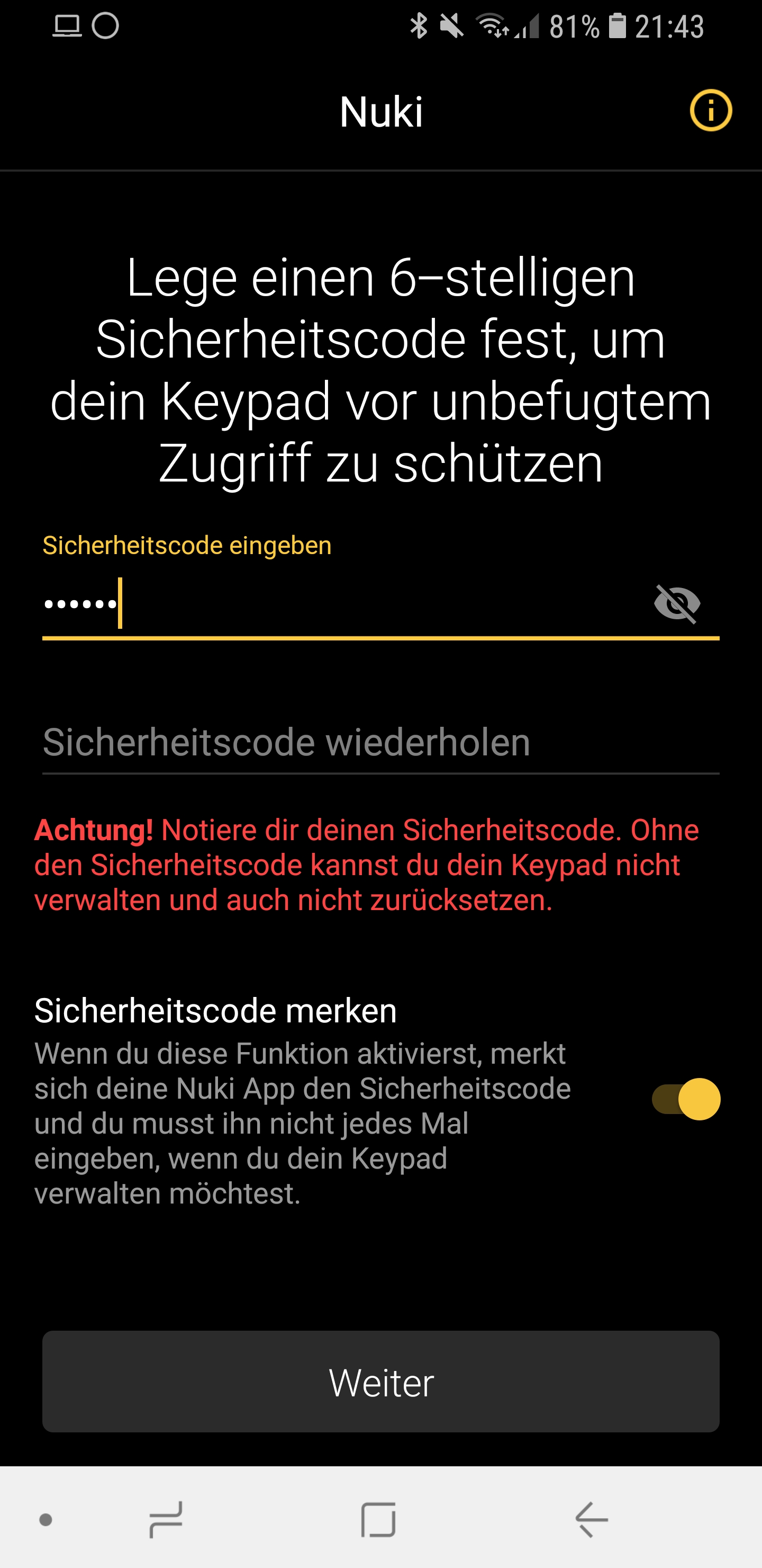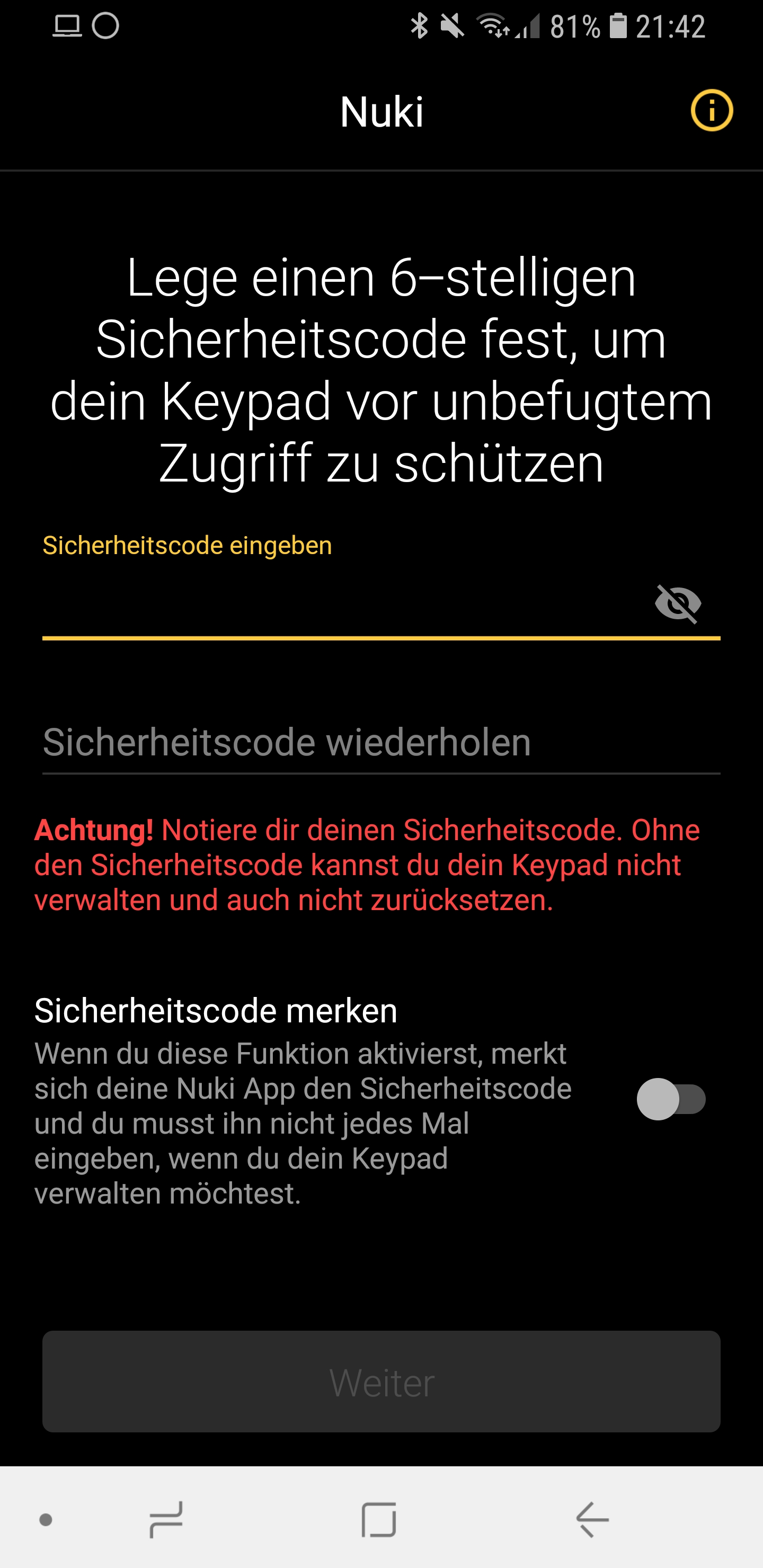 Eingerichtet wird das Keypad übrigens ganz normal über die App. Wie das geht, habe ich euch auch noch mal als Screenshots angehängt. Das Keypad ist übrigens auch mit dem Nuki Smart Lock der 1. Generation kompatibel!Da ich alleine wohne, denke ich, dass das Keypad etwas zu viel des Guten ist, mir gefällt die Auto Unlock Funktion mit dem Handy einfach am besten. Dennoch ist es sicherlich auch nicht verkehrt, eins draußen an der Tür hängen zu haben, da so das Risiko sich auszuschließen, nun wirklich gegen 0 fällt. Hier muss nur jeder für sich entscheiden, ob einem das der Preis von etwa 79€ wert ist.
