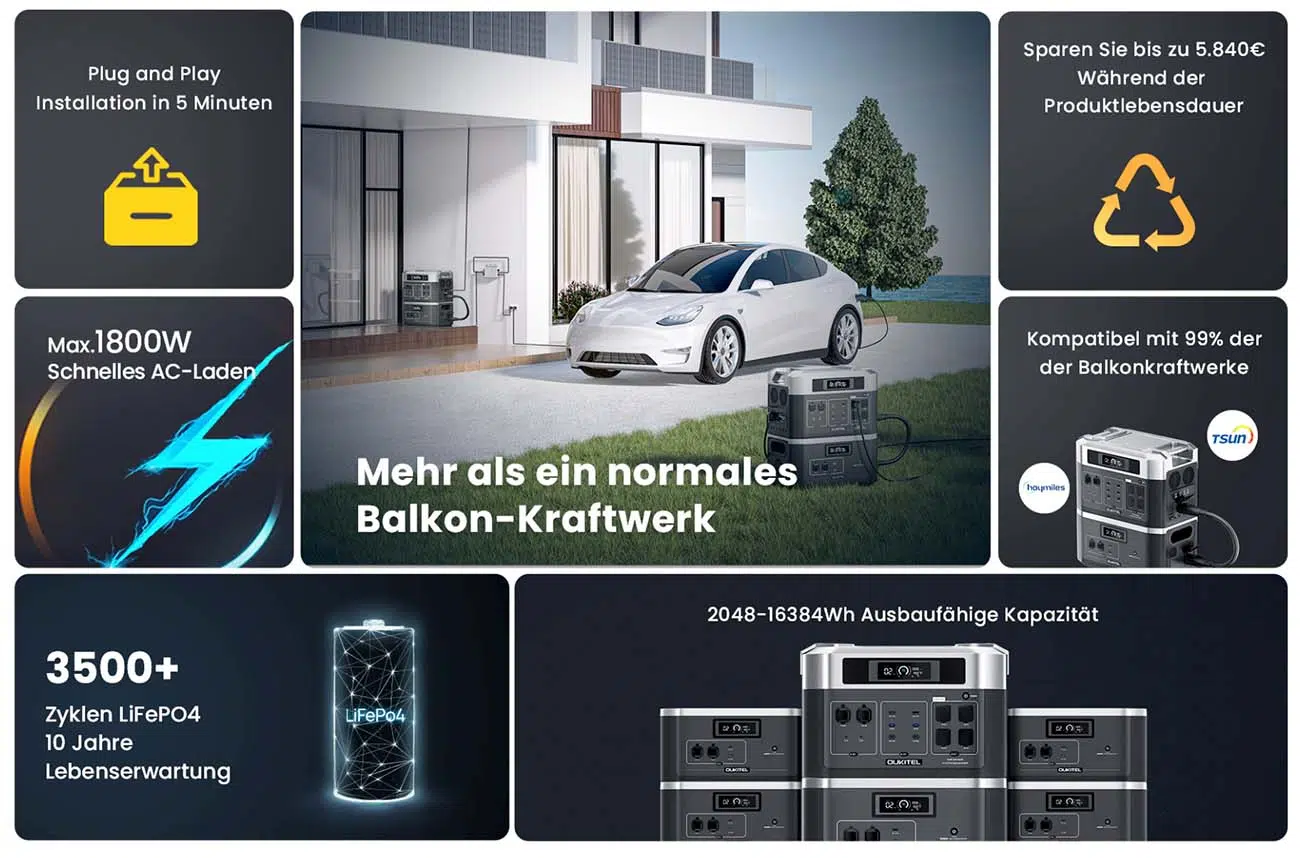 Mit einer Kapazität von 2.048 Wattstunden und einer Leistung von 2.200 Watt stellt die OUKITEL BP2000 eine leistungsstarke Energiequelle dar. Ihr fortschrittlicher LiFePO4 Akku ermöglicht die Integration von bis zu sieben Zusatzakkus, was sie zur idealen Wahl als Energiespeicher für die meisten Balkonkraftwerke macht. Mit insgesamt 15 Anschlüssen ermöglicht sie zudem die gleichzeitige Stromversorgung einer breiten Palette von Geräten.