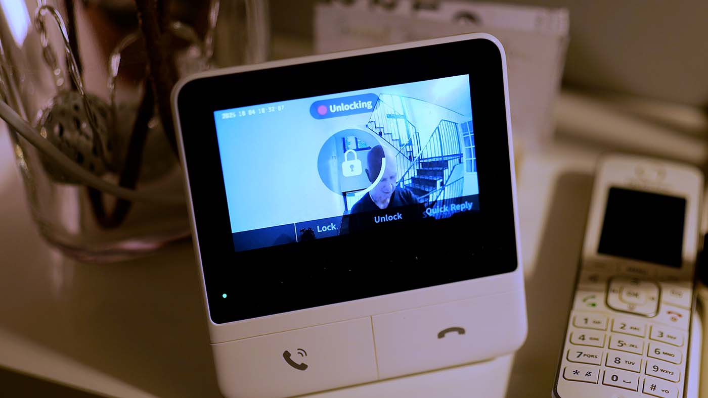 Mit der mitgelieferten Monitoreinheit siehst du direkt, wer klingelt, und kannst mit der Person kommunizieren. Auch von unterwegs hast du über dein Smartphone den Eingangsbereich im Blick. Praktisch, wenn der Postbote klingelt oder Besuch vor der Tür steht.