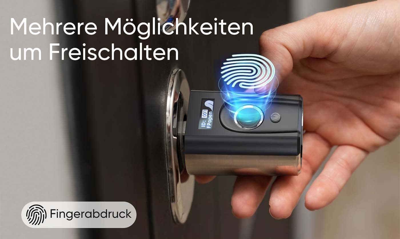 Zusätzlich lässt sich das Smart Lock per RFID-Karte (bis zu 20 Stück) oder mit der App (iOS und Android) öffnen. Über die App können außerdem elektronische Schlüssel (unbegrenzt) vergeben werden. Diese lassen sich dann verschicken, um auch Freunden oder Gästen Zutritt zu verschaffen, deren Fingerabdruck nicht eingespeichert ist.