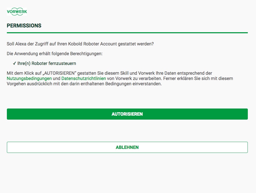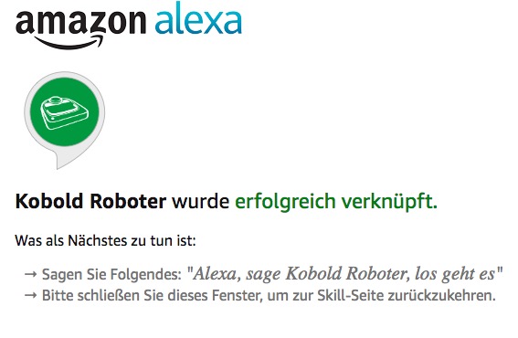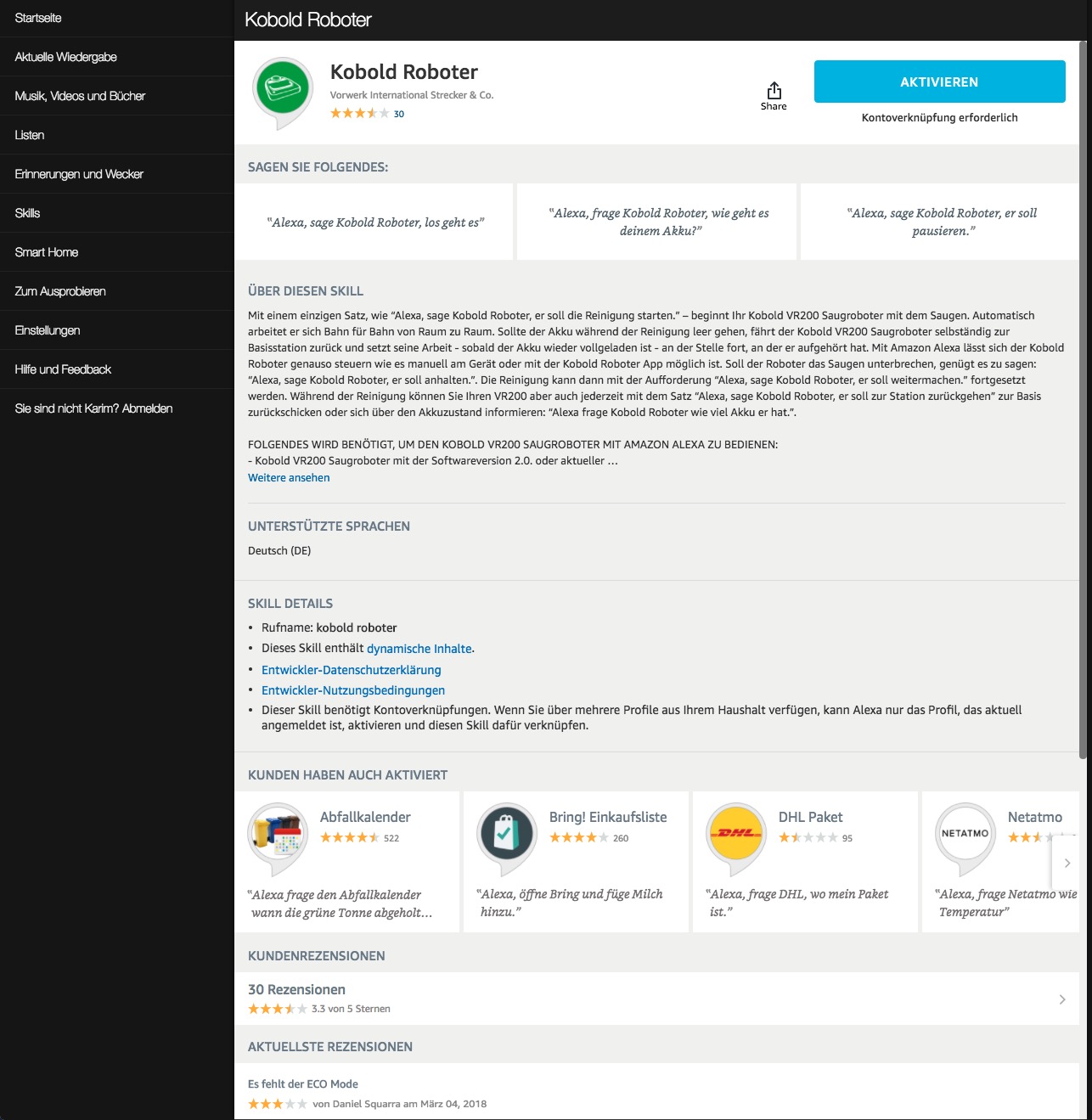 In den Screenshot habe ich den Skill für den Kobold VR200 an meinem Desktop aktiviert. Das geht natürlich ebensogut über die App. Ihr müsst lediglich auf „aktivieren“ klicken und im Anschluss eure Zugangsdaten für euer Vorwerk Konto eingeben. Schon wird die Verbindung zwischen Alexa und eurem Vorwerk Kobold VR200 Staubsauger Roboter hergestellt.
