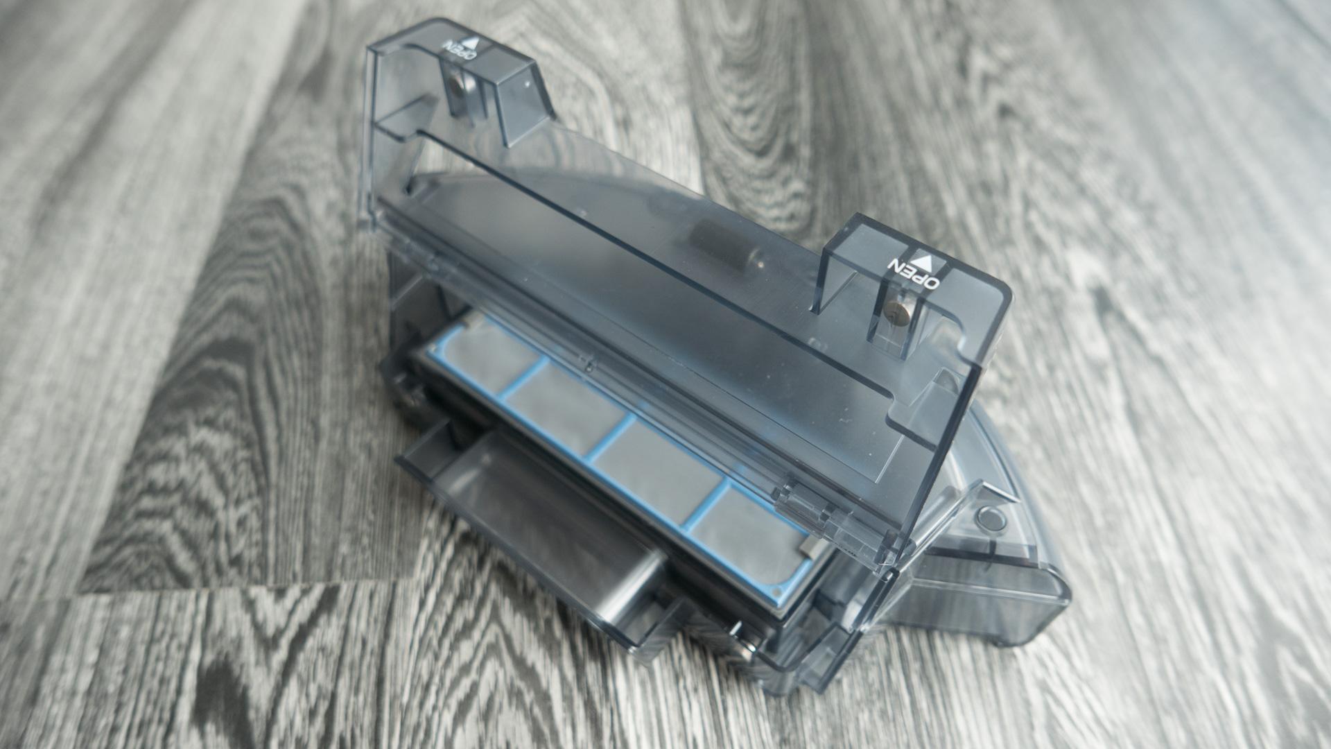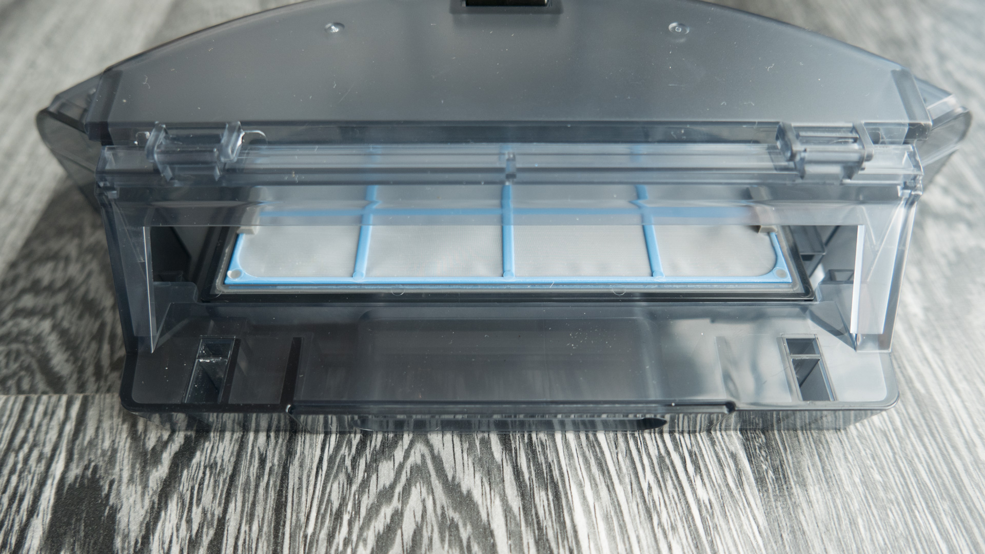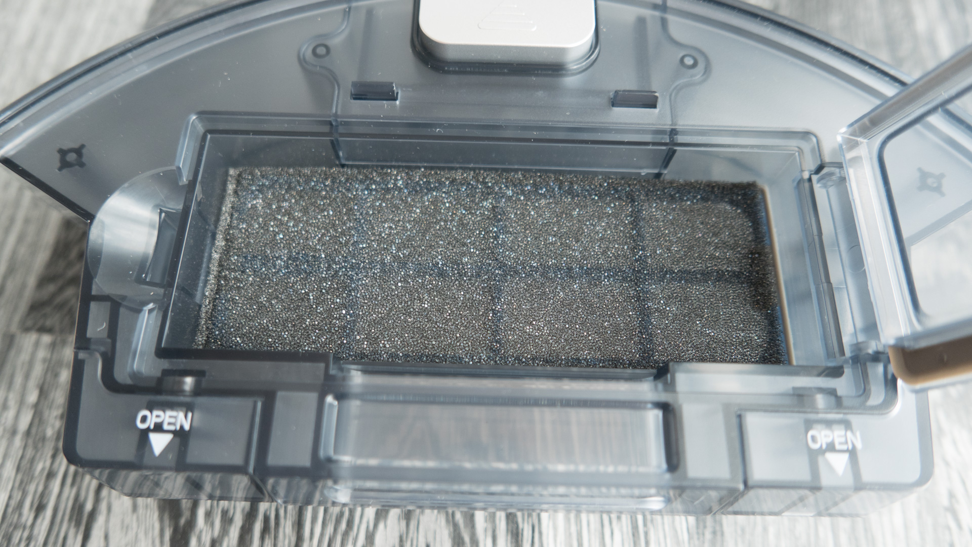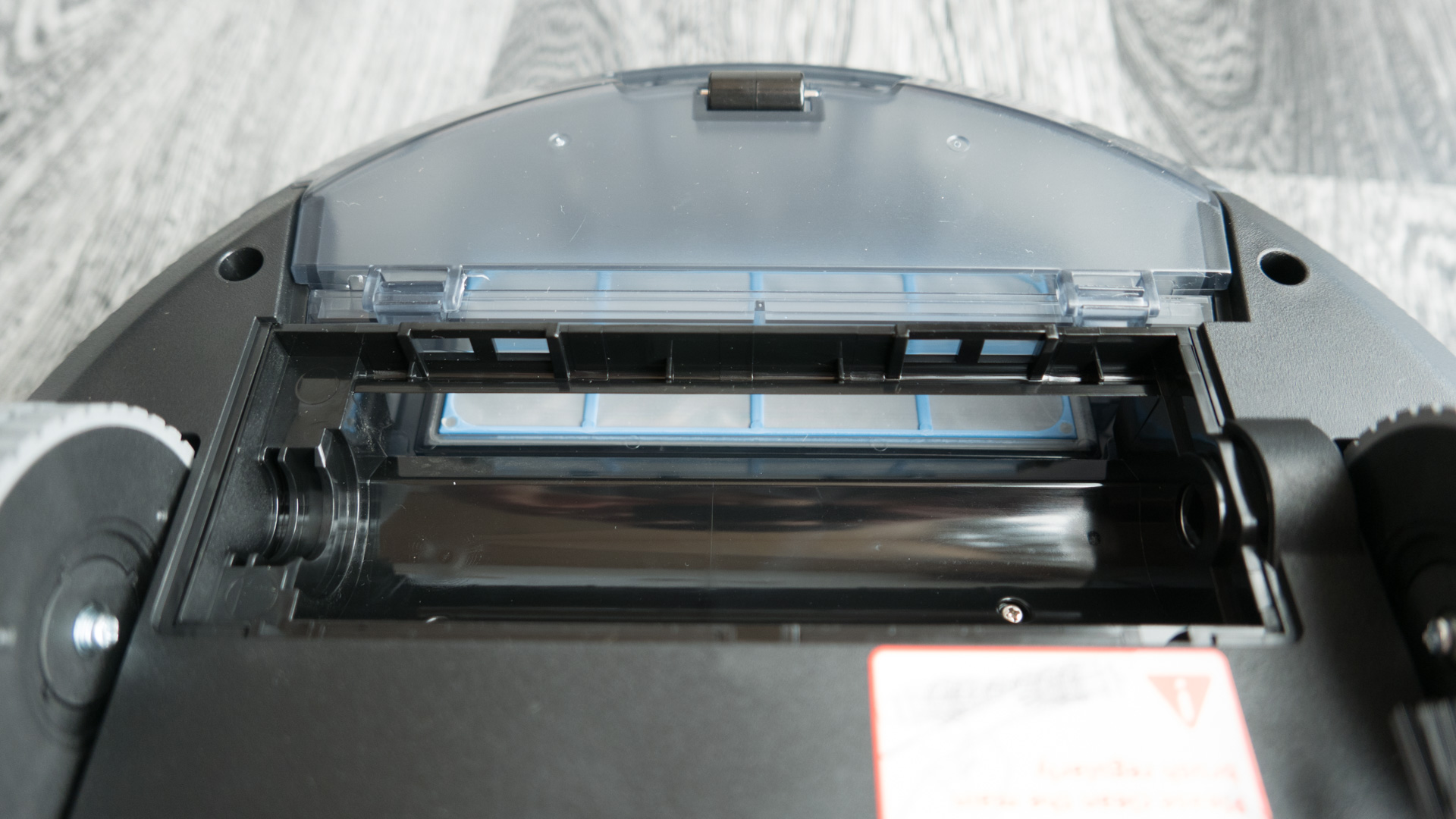 Der Staubbehälter ist schön zu entnehmen, hat meiner Meinung aber eine kleine Schwachstelle. Die Öffnung ist unten angebracht und so kann es passieren, dass beim Herausziehen schon ein Teil des Staubs auf den Boden fällt. Deshalb ist es ratsam, den Roboter vorher umzudrehen und erst dann den Behälter zu entfernen.