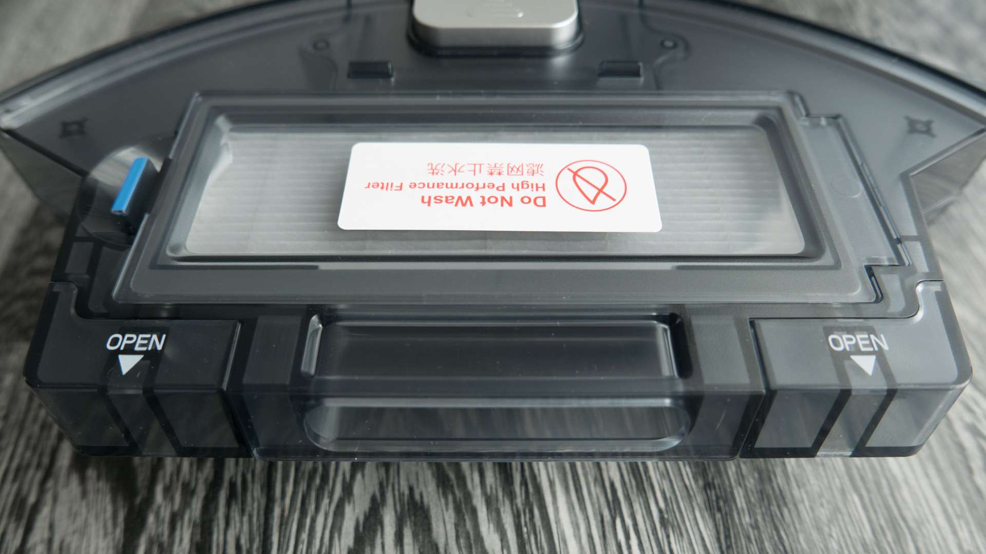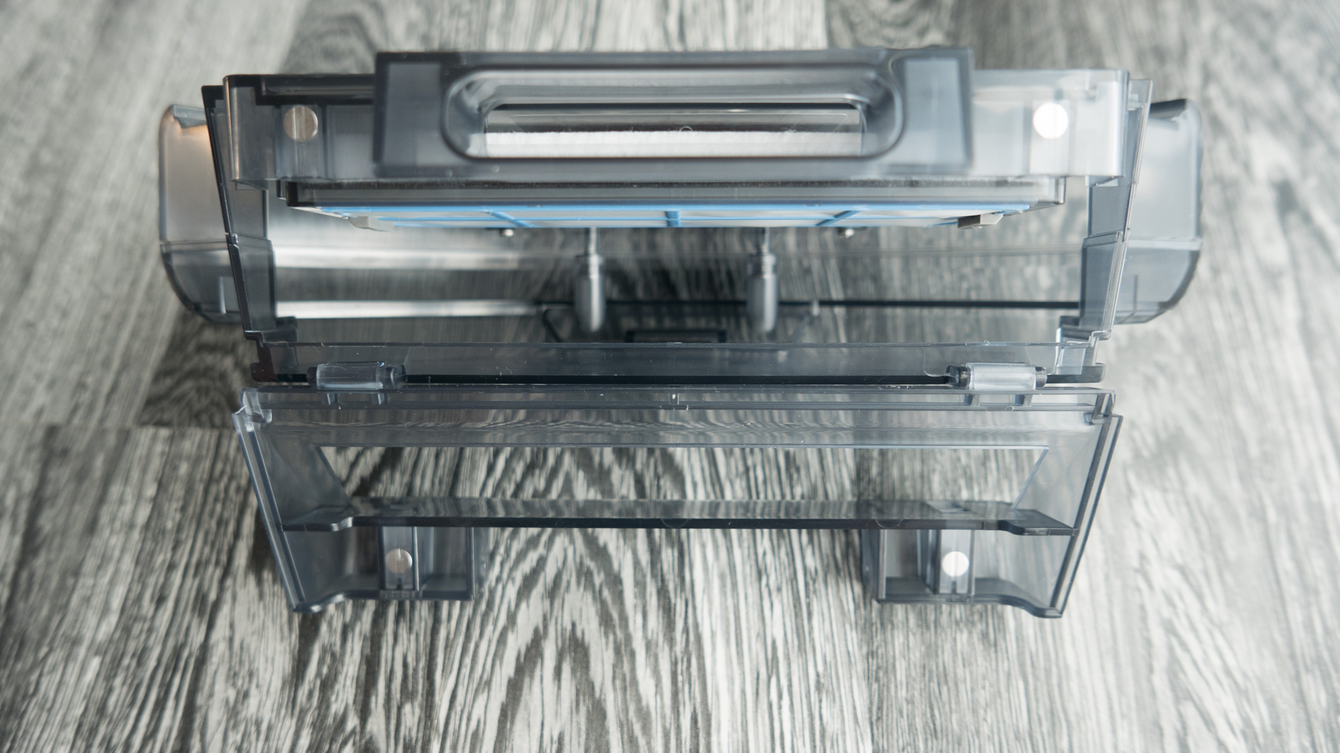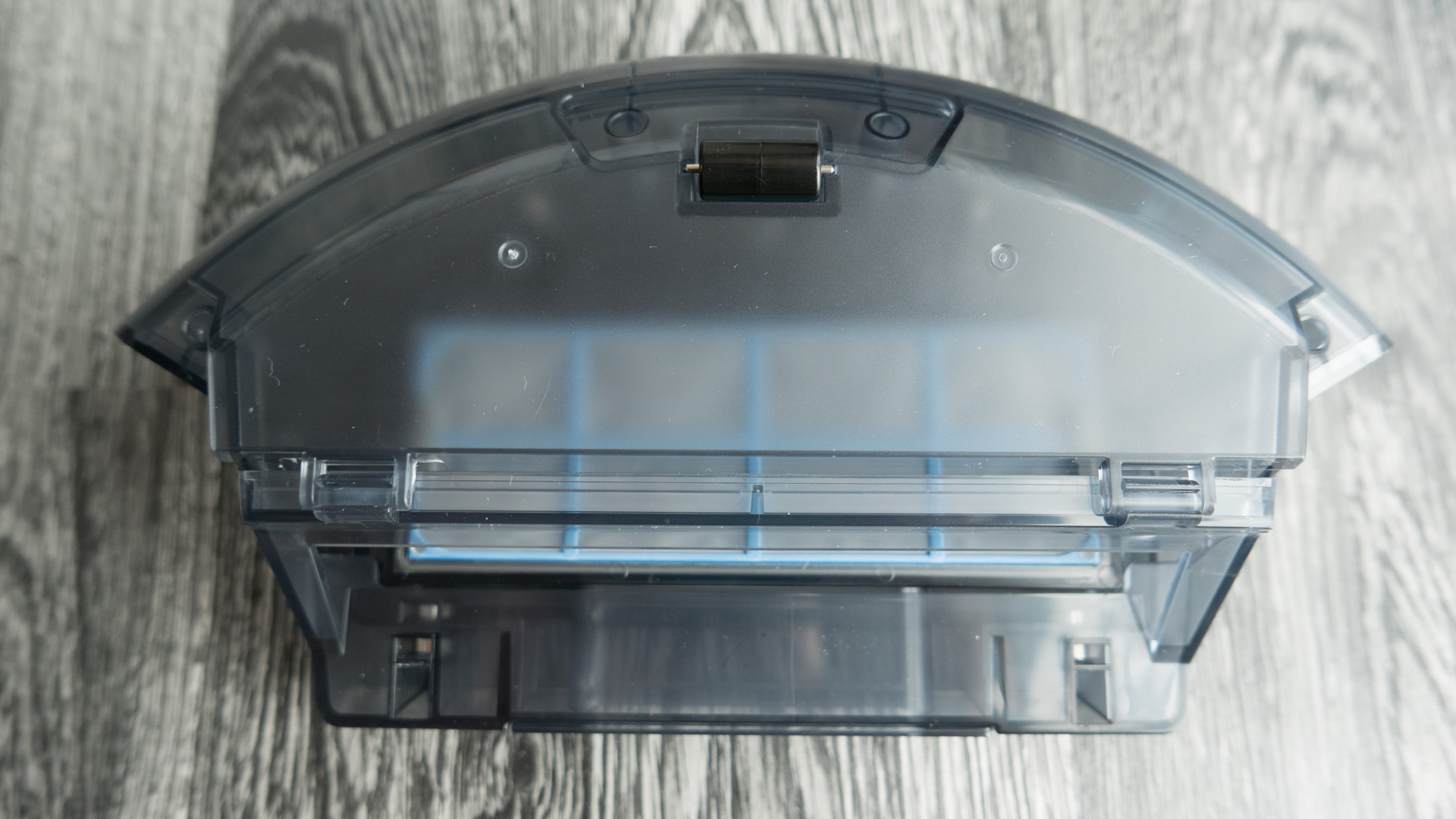 Der Staubbehälter ist schön zu entnehmen, hat meiner Meinung aber eine kleine Schwachstelle. Die Öffnung ist unten angebracht und so kann es passieren, dass beim Herausziehen schon ein Teil des Staubs auf den Boden fällt. Deshalb ist es ratsam, den Roboter vorher umzudrehen und erst dann den Behälter zu entfernen.