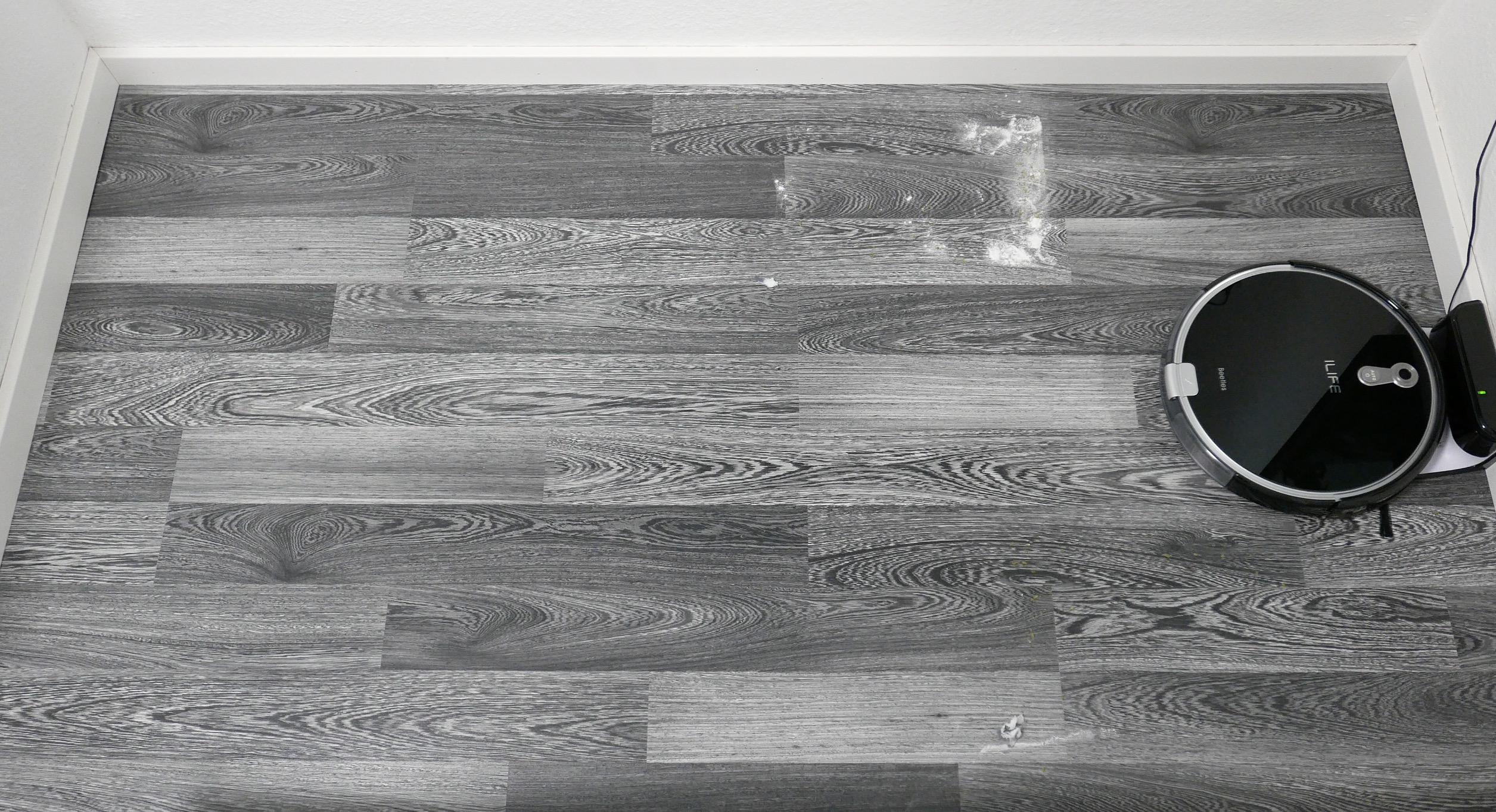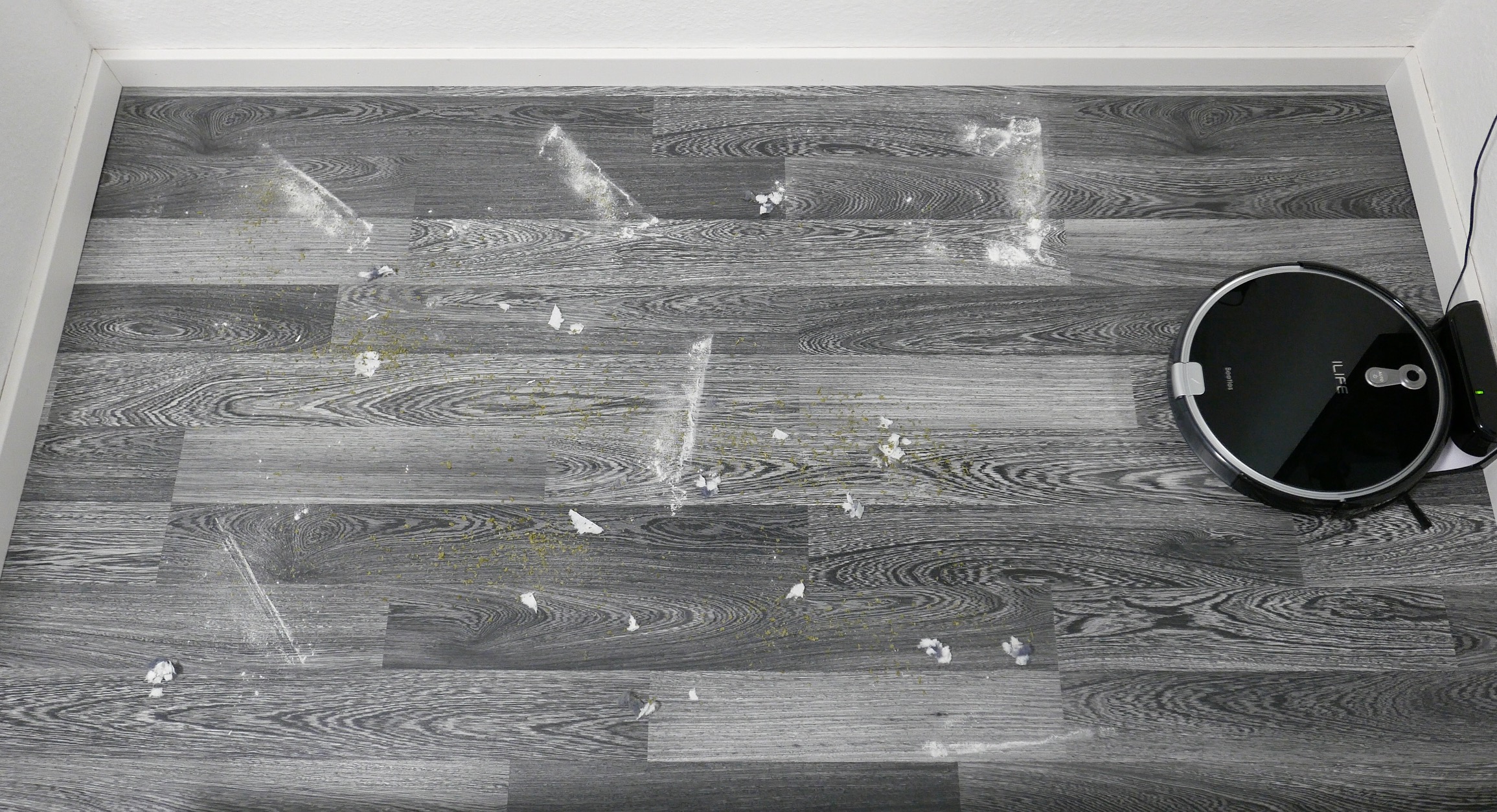 Da die Oberflächen bei mir „hart“ sind und sich so der Schmutz gar nicht erst richtig fest setzen kann, liefert der ILIFE A8 bei mir sehr gute Testergebnisse ab. Loser Staub, Krümel und ein paar meiner Haare sind kein Gegner für ihn, dafür musste ich nicht mal in den Max Modus schalten. Ich habe testweise in einem Areal Backpulver, Papierschnipsel und Kräuter verteilt. Das Backpulver, was wirklich hartnäckig am Boden ist, hat er wirklich zufriedenstellend aufgesaugt. Ein klein wenig blieb zwar übrig, aber das war bei der Menge, die ich verteilt habe, fast zu erwarten. Bitte nicht von dem zweiten Bild irritieren lassen. Bei sehr kleinen Reinigungsflächen, die nah an der