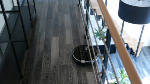 Auch Absturzsensoren helfen ihm bei seinem Weg, durch die Etagen. So wird sicher gestellt, dass er keine Treppen oder andere Abgründe herunter fallen kann. In meinem Fall, habe ich eine innenliegende Galerie, an deren Kante er sauber entlang navigierte und bis zur Kante alles aufsaugte.