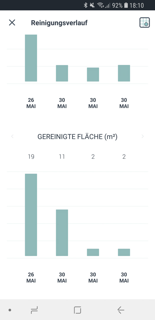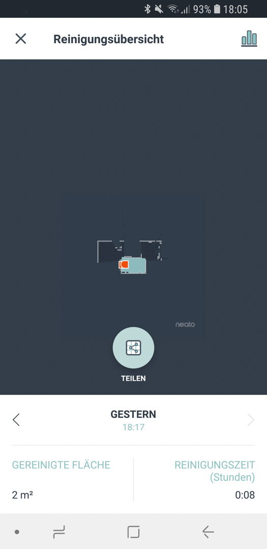 Die App ist klar strukturiert, nicht unnötig aufgeblasen und bietet alle Funktionen, die man benötigt! Von den Standards- Start, Pause und Stop, kann man zusätzlich noch einen Turbo Modus, sowie einen „Extra-Care“ Modus auswählen, sodass der Roboter behutsamer durch die Wohnung navigiert. Ohne diesen Modus ist er teils sehr ruppig und gibt nicht direkt auf, wenn er ein Hindernis erkennt. An dieser Stelle muss jeder selbst ein wenig rum probieren, wie er es einstellen möchte.