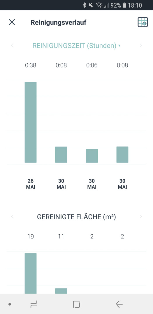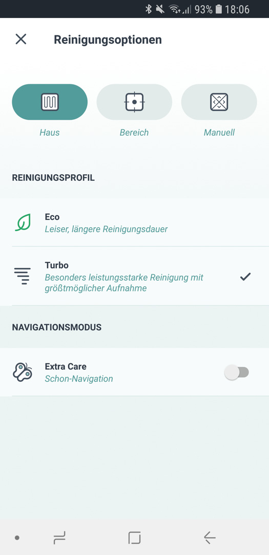 Bei den Reinigungsmodi gibt es keine Überraschungen. Wie bei den meisten anderen Robotern auch, kann man zwischen Haus, Bereich und Manuell wählen. Letztendlich belässt man es wahrscheinlich einfach beim Haus Modus, da in der Abwesenheit einfach alles gesaugt werden soll.