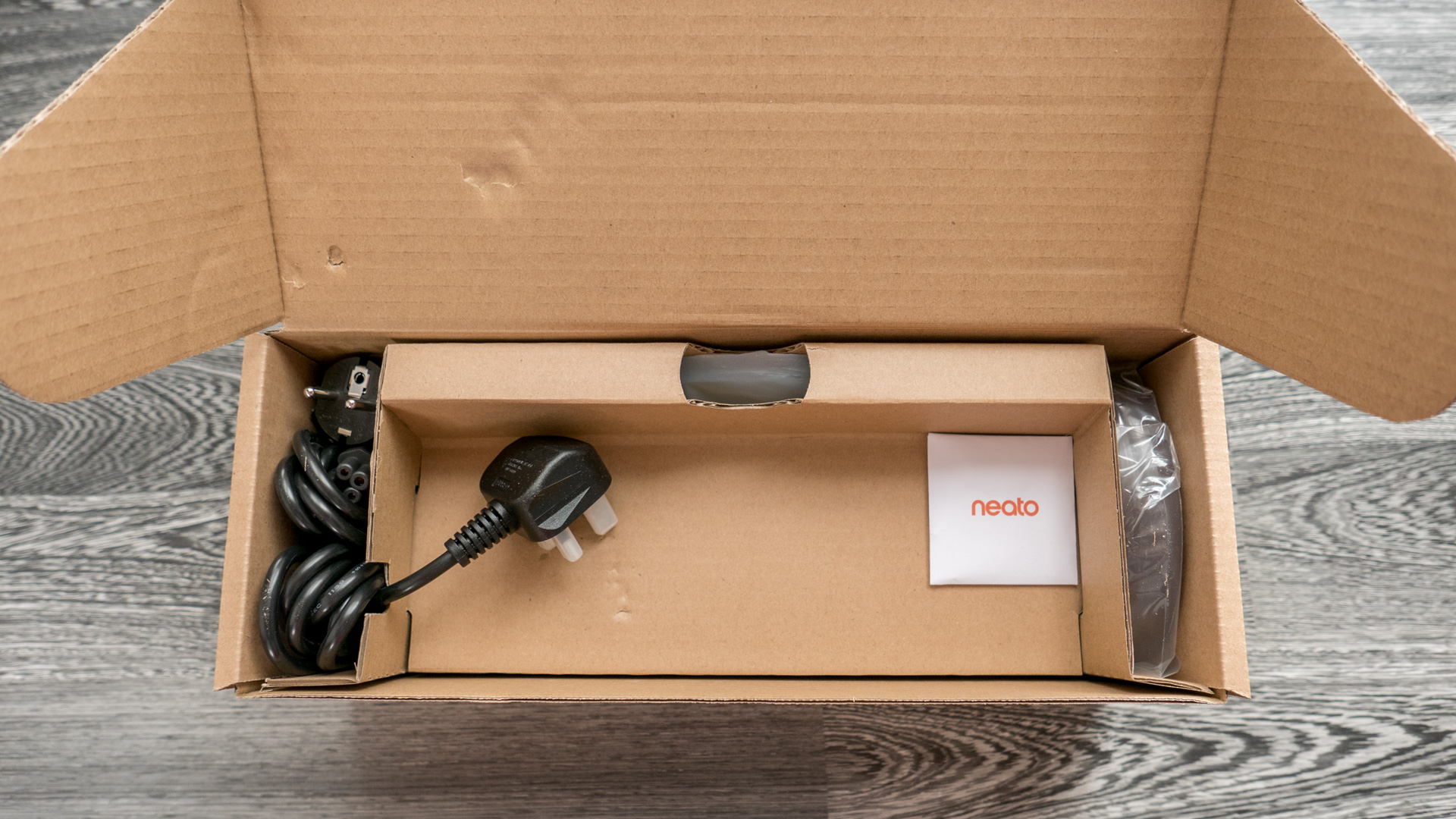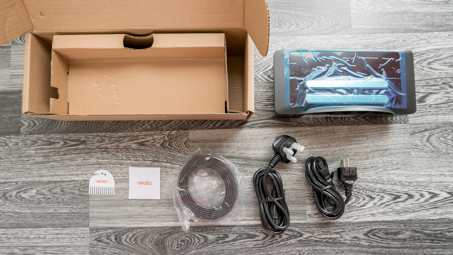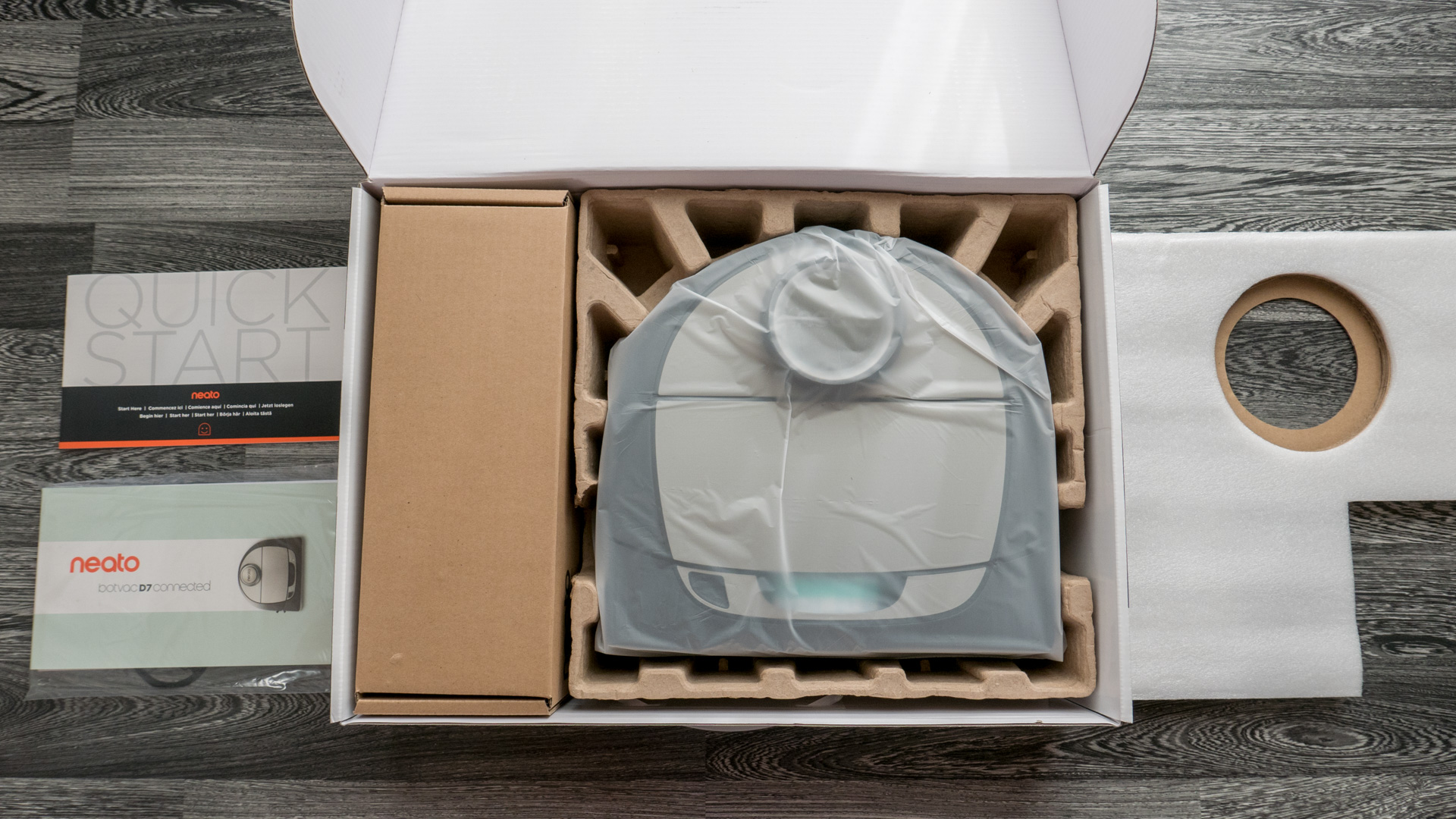 Schauen wir uns nun einmal an, was beim Neato Botvac D7 so an Zubehör mitgeliefert wird und wie alle Teile verstaut und verpackt sind.