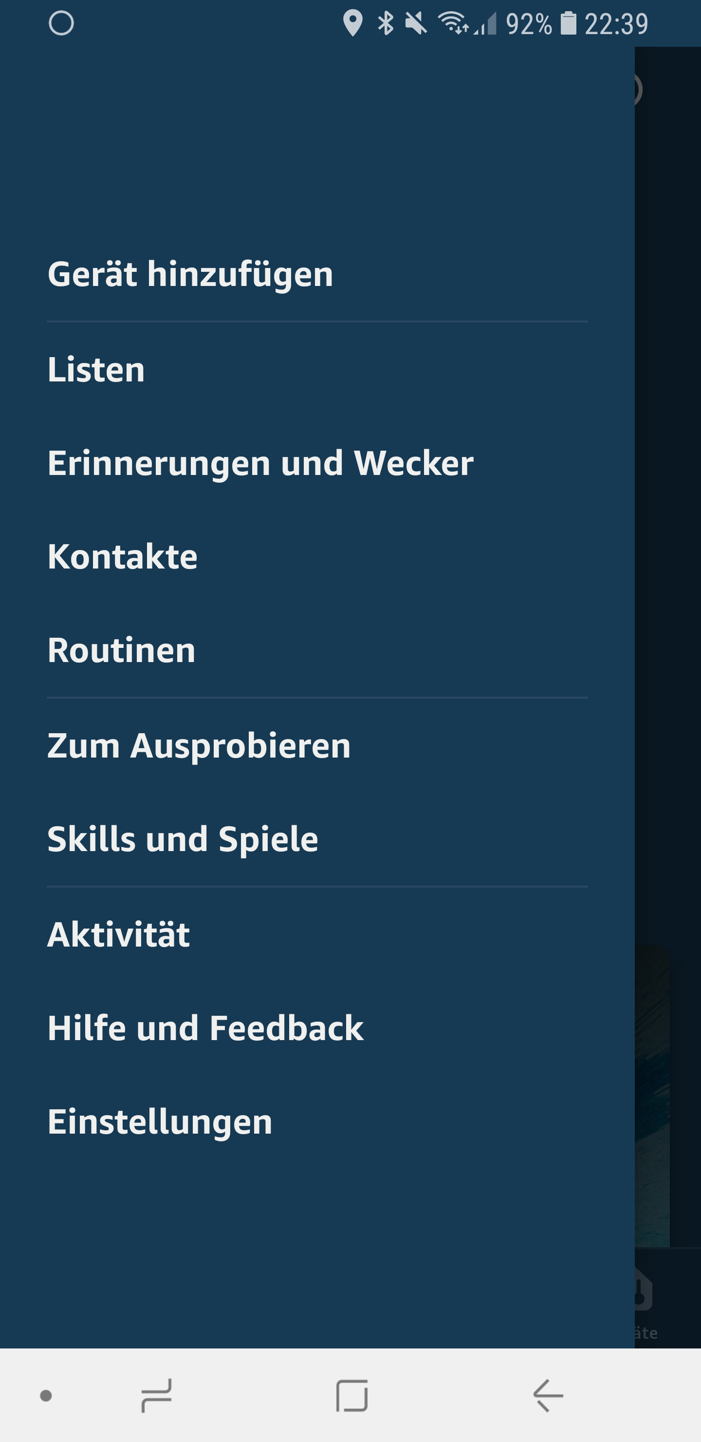 - Öffnet die Alexa App und wischt zur Seite, um das Menü zu öffnen. Wählt dann „Gerät hinzufügen“ aus.