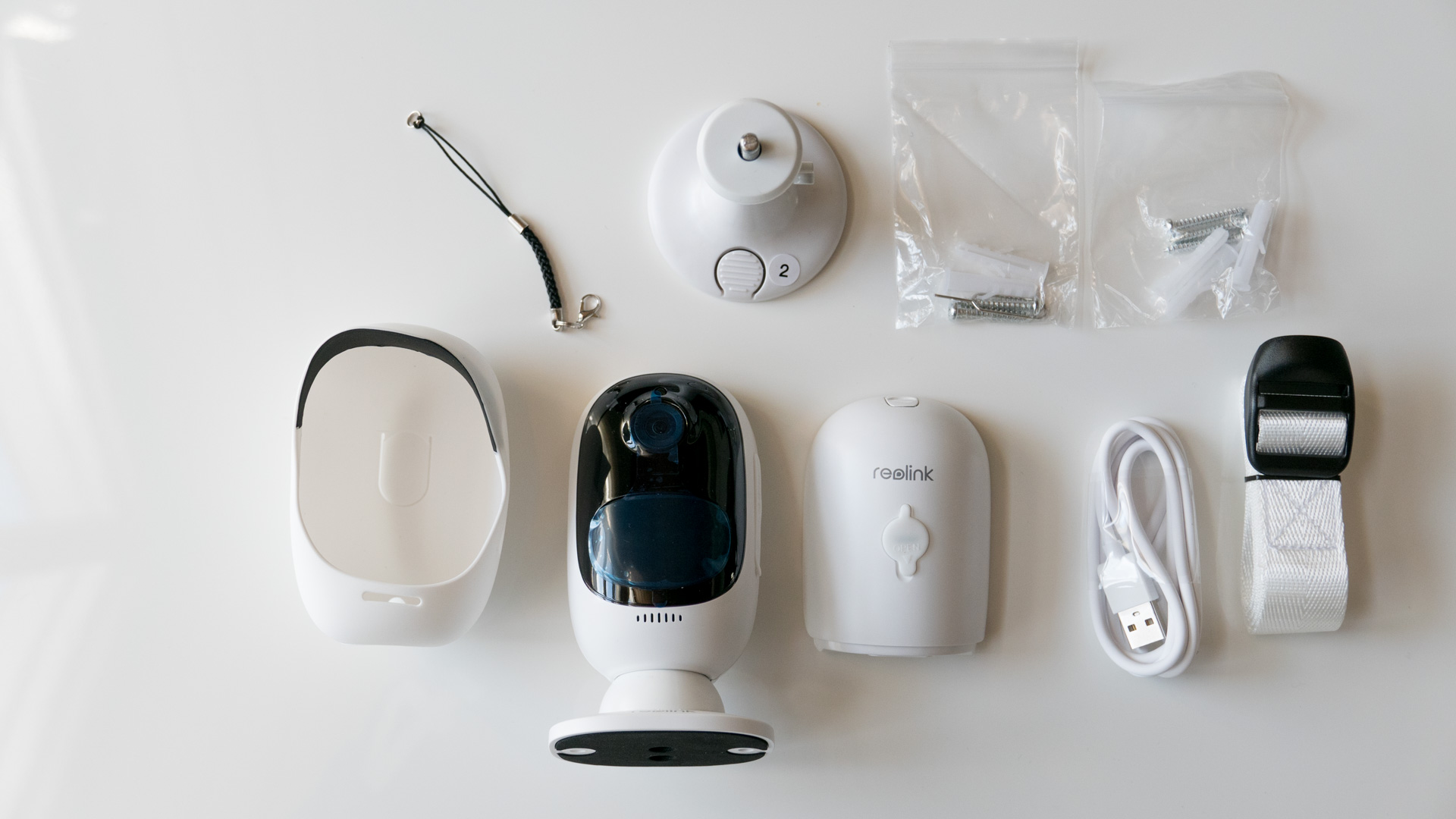 Wie ihr gut erkennen könnt, ist die Kamera ordentlich und sicher verpackt. Alle mitgelieferten Teile sind fest an ihrem Platz und können nicht verrutschen. Ein Transportschaden bei der Lieferung kann also fast ausgeschlossen werden. Der Akku und die Kamera selbst werden getrennt aufbewahrt, sodass auch hier nichts passieren kann. Das weitere Zubehör wird platzsparend im Silikon-Case der Kamera verstaut. Dieses Case könnt ihr über die Argus 2 stülpen, um sie so noch besser vor äußeren Einflüssen zu schützen.Der Lieferumfang beinhaltet folgende Teile: