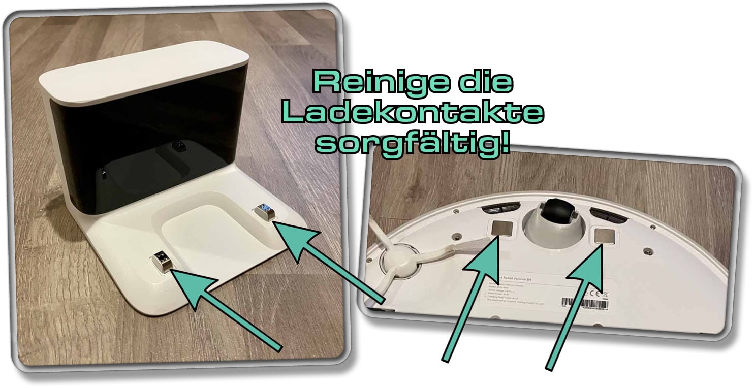 Oftmals kann der Dreame Saugroboter nicht mehr an seiner Ladestation andocken, weil Verschmutzung den Kontakt der Ladekontakte behindert. Befindet sich eine leichte Schmutzschicht auf diesen, könnte das der Saugroboter bemerken und ihm am ordnungsgemäßen Andocken hindern, weil der Strom nicht mehr ordentlich fließt. Reinige die Ladekontakte unter dem Saugroboter und auf der Ladestation mit einem feuchten Tuch. Bitte trenne vorher die Ladestation vom Strom und schalte den Roboter aus! So könnte der Dreame die Station direkt danach wiederfinden.