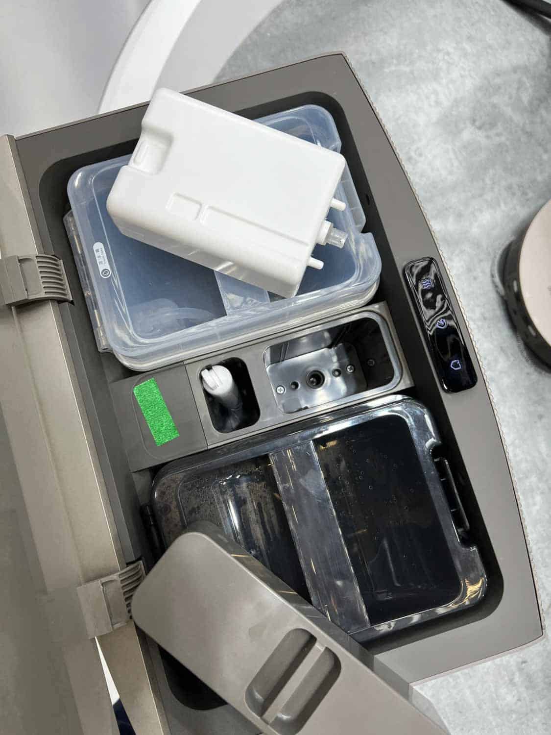 Und jetzt kommt die absolute Neuerung. Haltet euch fest: Wenn ihr den Roboter nur zum Saugen und nicht zum Wischen losschickt, dann entnimmt die Station automatisch die Wischmopps und behält diese in der Station! Wenn es wieder auf einen Saug-Wischgang gehen soll, montiert die Station die runden Wischmopps vollautomatisch selbständig an den Roboter.