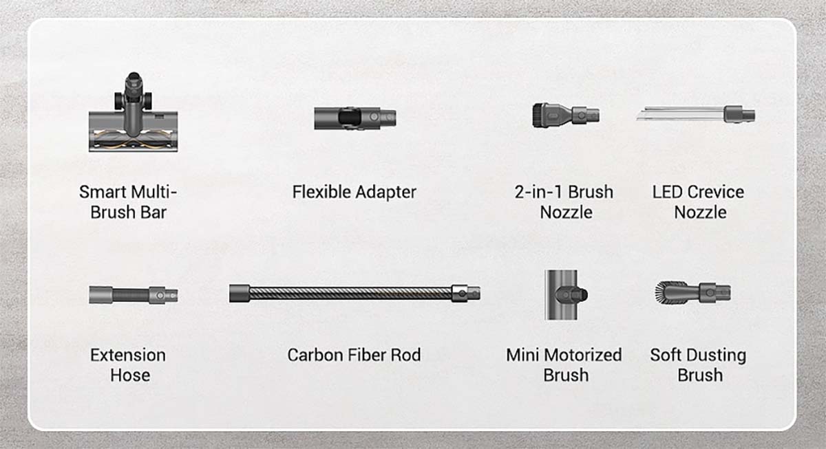 Das Zubehör ist im Vergleich zum V16 leicht verändert. So gibt es den Wischaufsatz, den es beim Dreame V16 gibt, leider nicht beim V12 Pro. Wie schon beim Dreame T30 besitzt auch der V12 Pro eine beleuchtete Fugendüse.