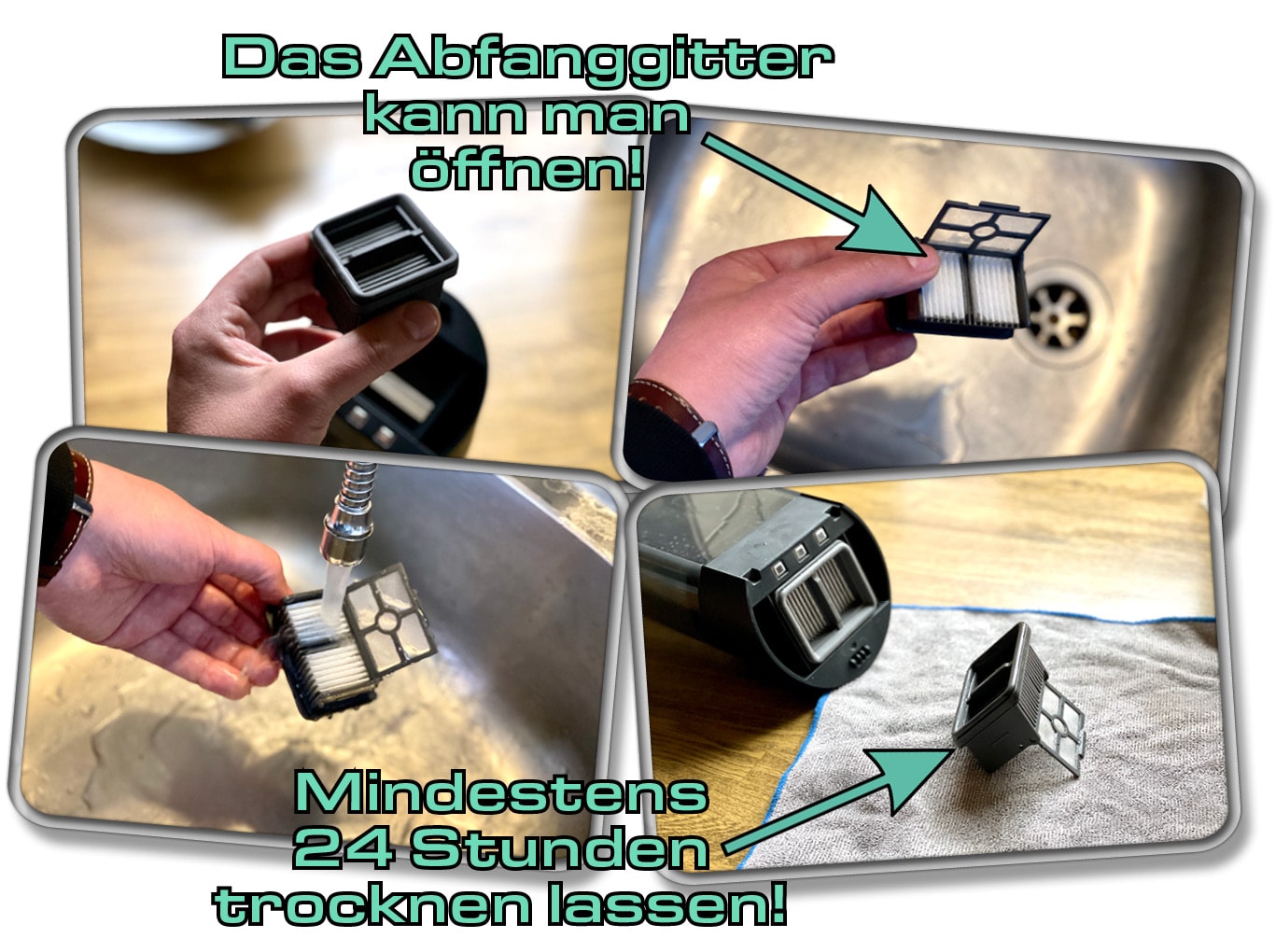 Wenn ein Filter verstopft ist, dann hat die Abluft weniger Möglichkeit zu entweichen. Das kann dazu führen, dass sich ein leichter Überdruck im Abwasserbehälter aufbaut. Dieser drückt dann an jeden verfügbaren Öffnungen ein wenig Wasser heraus. Verhinder das, indem du gelegentlich den eingesetzten Staubfilter auf Beschädigungen, Verschmutzungen und Lebensdauer kontrollierst. Reinige ihn regelmäßig.