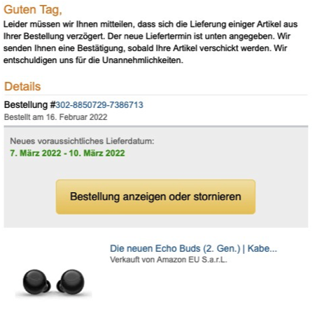 Nach der Vorbestellung sollten die Echo Buds direkt am 24. Februar geliefert werden, und auch ich habe mir direkt ein Paar bestellt. Am Tag der eigentlichen Lieferung erhielt ich dann jedoch eine Mail von Amazon, dass sich die Lieferung verzögert und die Echo Buds erst zwischen dem 07. und 10. März bei mir eintreffen werden. Auf Nachfrage in unserer Facebook-Gruppe meldeten mehrere Nutzer, dass sie ebenfalls eine solche Mail erhalten haben. Andere Nutzer wiederum berichteten, dass ihre Echo Buds bereits geliefert wurden.