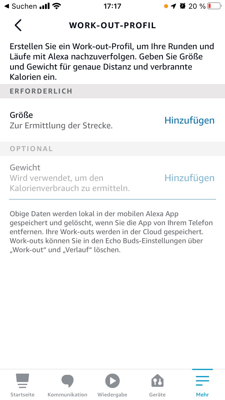 Nun taucht in der Alexa App ein neuer Punkt Work-out auf und dieser ist nur für die Echo Buds gedacht. Hier musst zuerst ein Work-Out Profil erstellen, indem du deine Größe und optional dein Gewicht hinterlegst. Schon steht dem nächsten Fitness-Tracking nichts mehr im Weg.