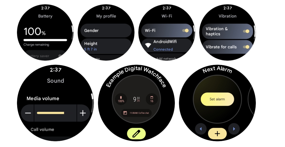 Neu in den Einstellungen ist auch das Menü „Gesundheitsdienste“, das ein Symbol von Google Fit anzeigt und Optionen für Geschlecht, Größe und Gewicht bietet. Schließlich hat Google auch das Menü zur Watchface-Auswahl komplett überarbeitet. Gekrümmter Text am oberen Rand des Bildschirms zeigt den Watchface-Titel an, während unter der Watchface-Vorschau eine helle Bearbeitungsschaltfläche zu sehen ist. Darüber hinausgehende Optionen sind praktisch identisch. Das gleiche UI-Update wurde auch auf die Auswahl von Kacheln erweitert.