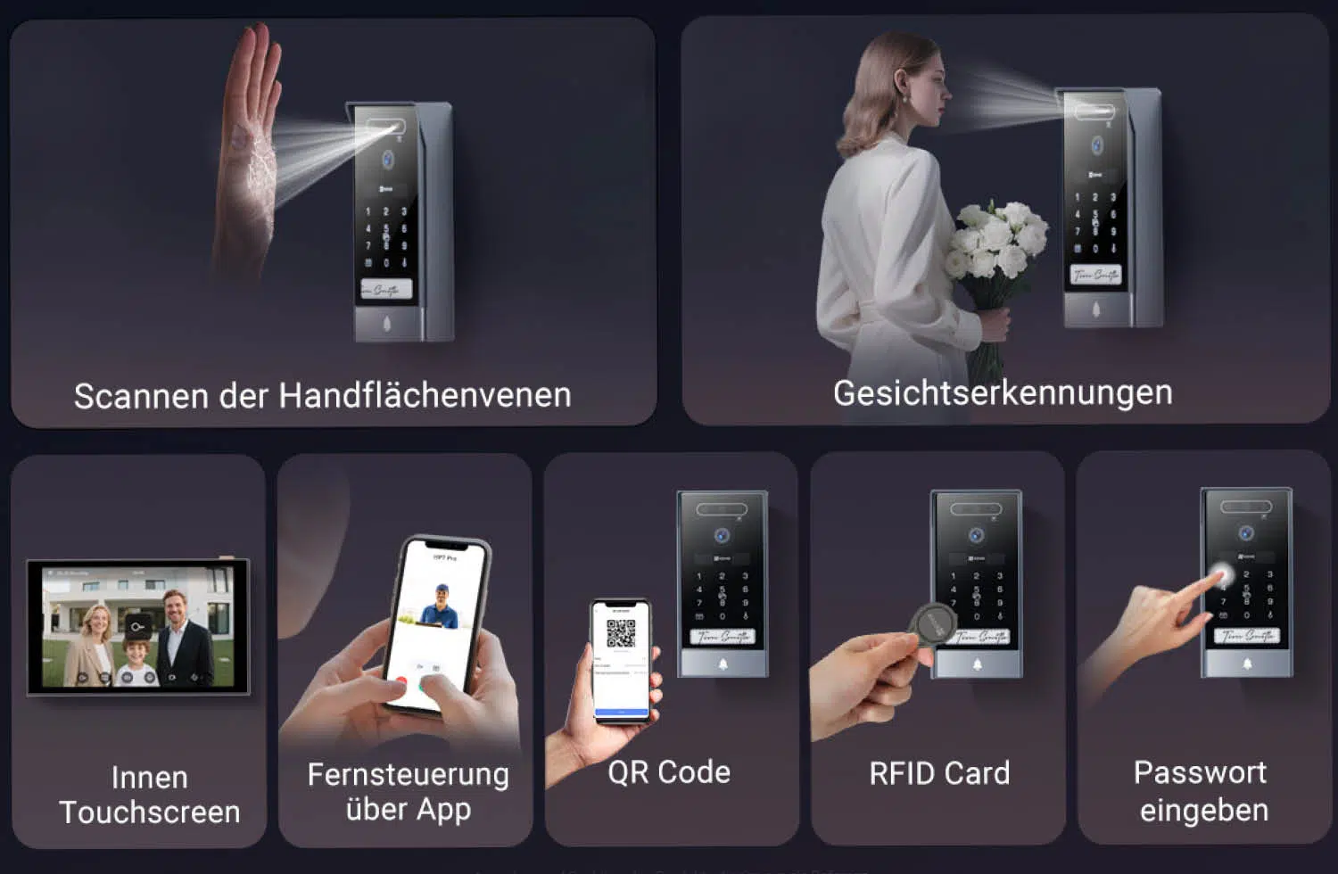Die HP7 Pro bietet gleich mehrere Optionen, um den Zugang zu ermöglichen. Das Highlight ist die neue biometrische Handflächenerkennung, die anhand der Venenstruktur in der Handfläche arbeitet, sicher, kontaktlos und schnell. Alternativ kann man auch per Gesichtserkennung, QR-Code, Passwort, Smart-RFID-Tag oder per EZVIZ-App die Tür öffnen.