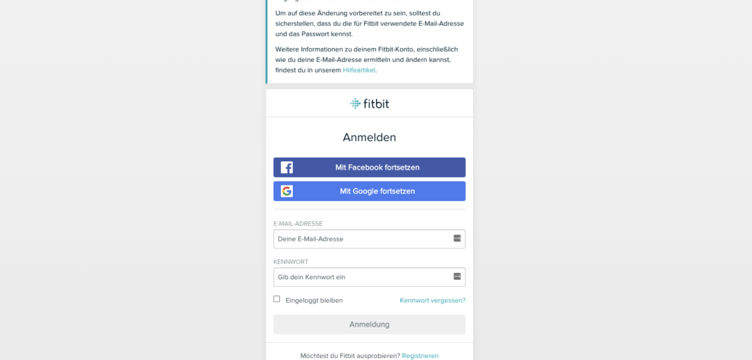 Wenn man sich derzeit auf der Website von FitBit einloggen möchte, gibt es einen Hinweis, der einem mitteilt, dass künftig kein Login mehr über Facebook möglich sein wird.