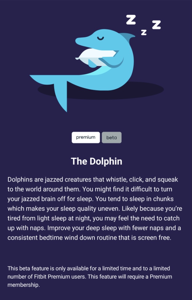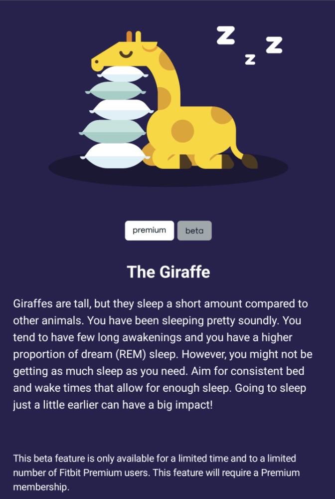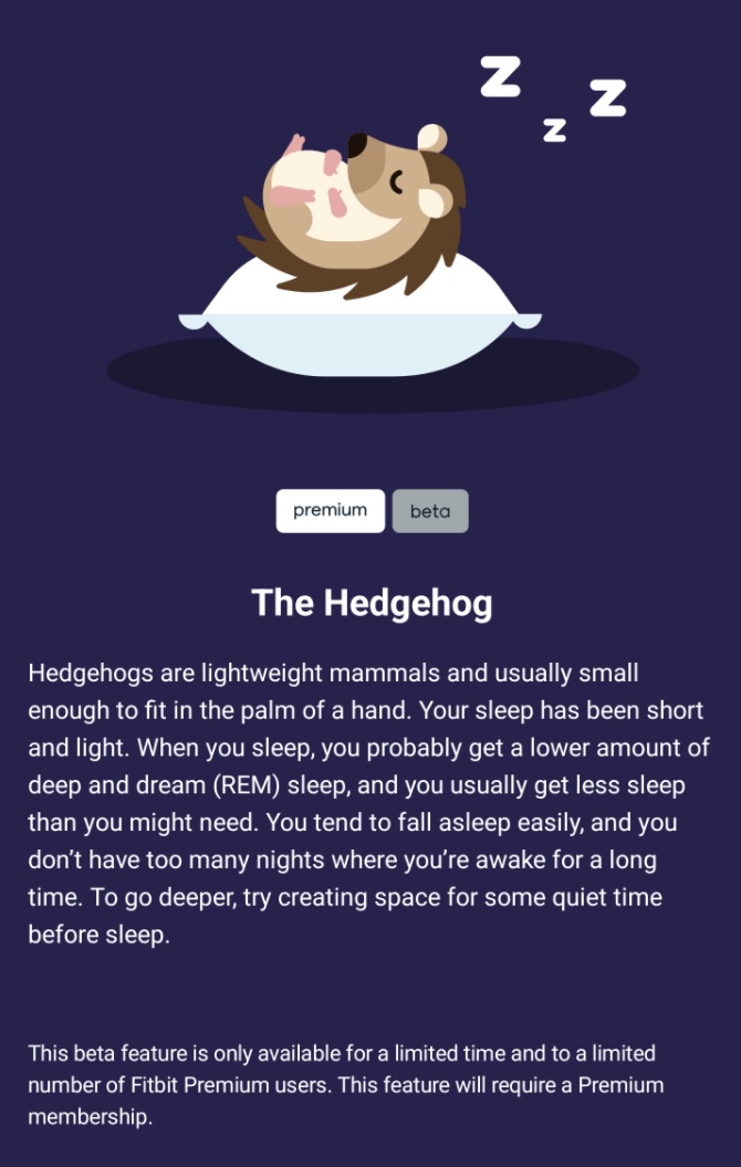 Steht die Funktion zur Verfügung, kannst du beispielsweise auf „Schlaf war kurz“ klicken um auf eine ganze Seite zu gelangen, die dir dann das jeweilige kleine, niedliche Tierchen anzeigt. Außerdem beschreibt Fitbit darunter noch, warum das Tier bzw. seine Schlafeigenschaften deinen ähneln und einem Hinweis, wie du deinen Schlaf verbessern kannst.