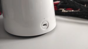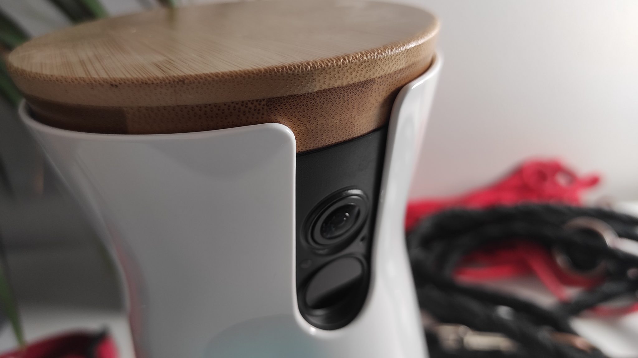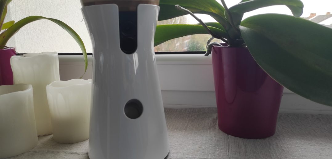 Das Design ist sehr schlicht und wirkt durch die weiße Farbe und dem Bambusdeckel eher wie eine Dekoration als eine Überwachungskamera.