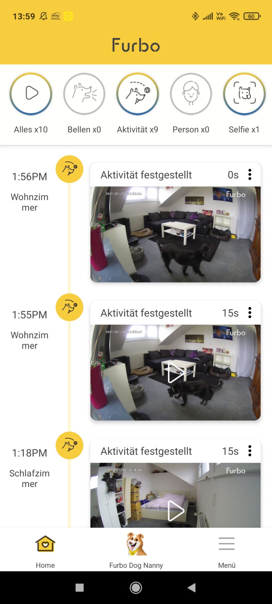 Mit der Furbo Dog Nanny stellt der Hersteller weitere Funktionen zur Verfügung. Dazu zählen neben einem Alarm für Heimnotfall, dauerhaftes Bellen, Wimmern, Heulen, Personen, Aktivitäten und Selfie auch das Cloud Recording (24 Stunden ereignisbasiert) und das Hundetagebuch. Letzteres ist ein maximal ein minütiges Video mit verschiedenen „Highlights“ des Hundetages zusammengeschnitten und mit Musik unterlegt. Bald verfügbar soll auch ein Alarm für Hundenotfall sein. Außerdem ist es mit dem Dog Nanny-Abo möglich, sich über die App Benachrichtigungshinweise aufs Smartphone senden zu lassen.