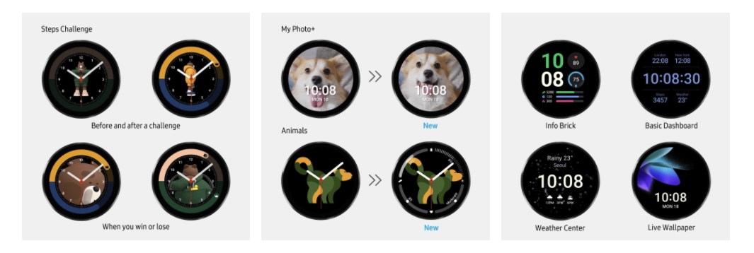 Außerdem kommen auch vier neue Watchfaces mit dem inforeichen „Basic Dashboard“ und „Info Brick“, sowie ein „Wetter Center“. Es gibt auch ein neues „Live Wallpaper“-Watchface und atchface „MyPhoto+“ wird ebenfalls aktualisiert, um geloopte Videos/GIFs zu unterstützen, und das Watchface „Animals“ bekommt rundum Komplikationen. Abgerundet werden die neuen Watchfaces durch das „Steps Challenge“-Gesicht mit neuen Animationen.