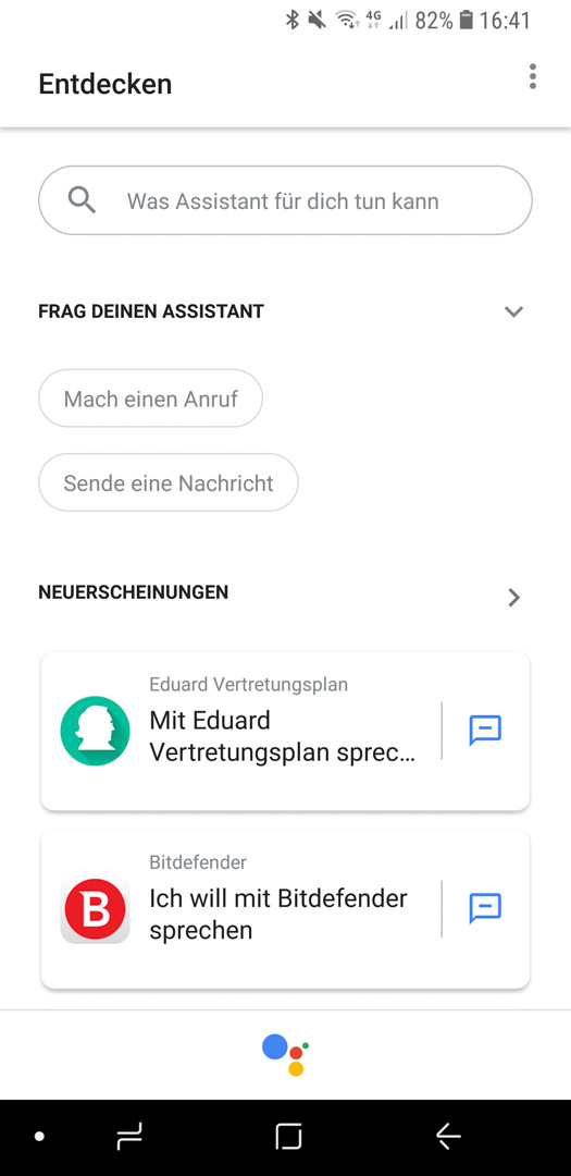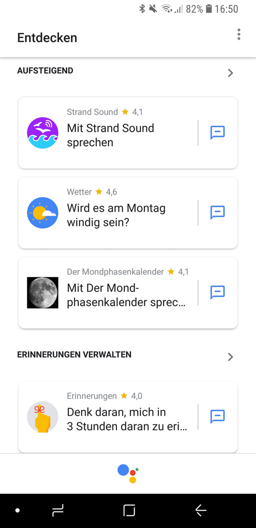Um diese Funktion nutzen zu können, muss der „Ok Google“ Befehl ausgeführt werden. Daraufhin erschein ein Briefumschlag, der euch in das Entdecken Menü führt. Von dort aus lassen sich dann die Actions einsehen und auch mit Klick auf die entsprechenden, bewerten.
