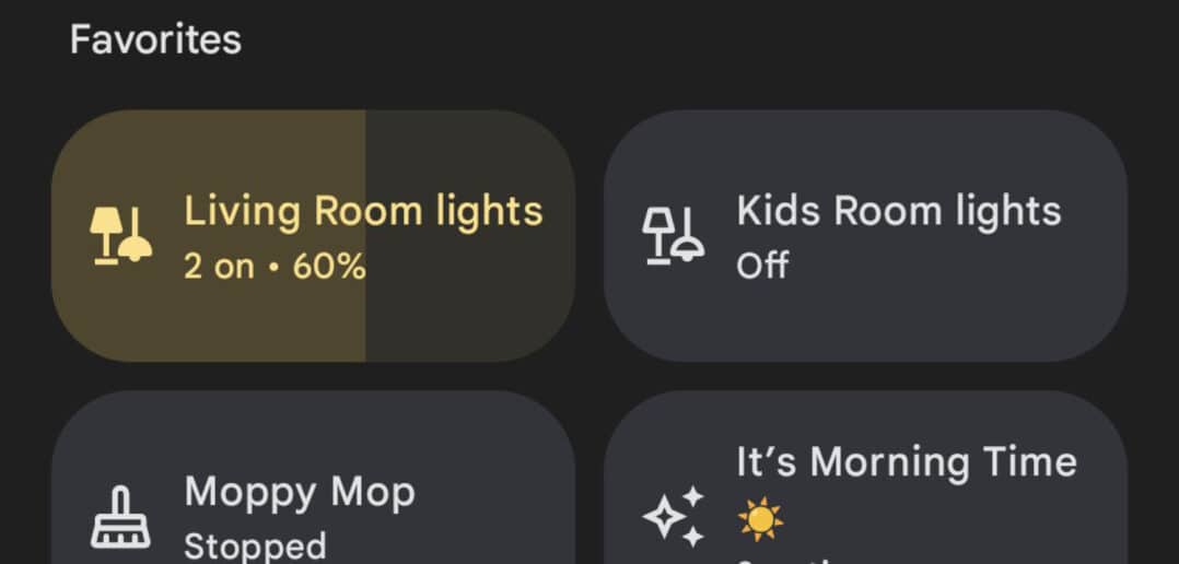Jetzt hat Google das Problem endlich beseitigt. Raumlichter wurde jetzt zu den Favoriten hinzugefügt. Somit ist ein unpraktisches Umgehen nicht mehr notwendig. Alle Leuchten werden jetzt in diesem Abschnitt zusammengefasst und können mit nur einem Tipp an- oder ausgeschaltet werden. Die Belegung erfolgt natürlich ganz individuell.