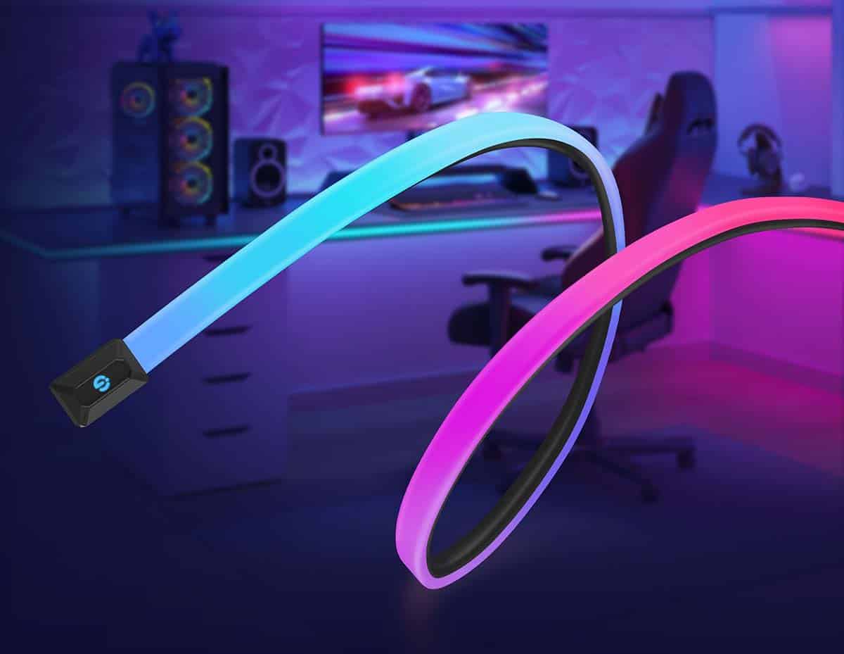 Das Govee Neon Rope Light ist ein besonders flexibler LED-Strip, welcher an der Kante eines Schreibtisches Platz finden soll. Er ist drei Meter lang und besonders flach, wodurch er zusätzlich Flexibilität bietet. Der Lightstrip von Govee lässt sich bei Bedarf sogar mit einer Schere kürzen und lässt sich somit individuell an den Arbeitsplatz anpassen. Der Lightstrip kann auch mit der Govee AI Sync Box verbunden werden, wodurch sich das Licht zum Inhalt des Bildschirms synchronisieren kann.