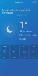 Die App verfügt, wie oben bereits erwähnt, über eine Wetteranzeige. Durch das Zulassen des Ortungsdienstes wird der Ort der Wetteranzeige automatisch bestimmt. Die Bestimmung an sich ging reibungslos und auch wirklich genau. Sogar mein Ortsteil wird benannt. Allerdings wird dieser in meinem Fall einem falschen Regierungsbezirk zugeordnet, was die Funktion an sich aber in keiner Weise beeinträchtigt. Neben der aktuellen Temperatur werden auch Luftdruck, Sonneneinstrahlung, Regenwahrscheinlichkeit und eine Kurzübersicht der Wetteraussichten für die nächsten 7 Tage dargestellt.