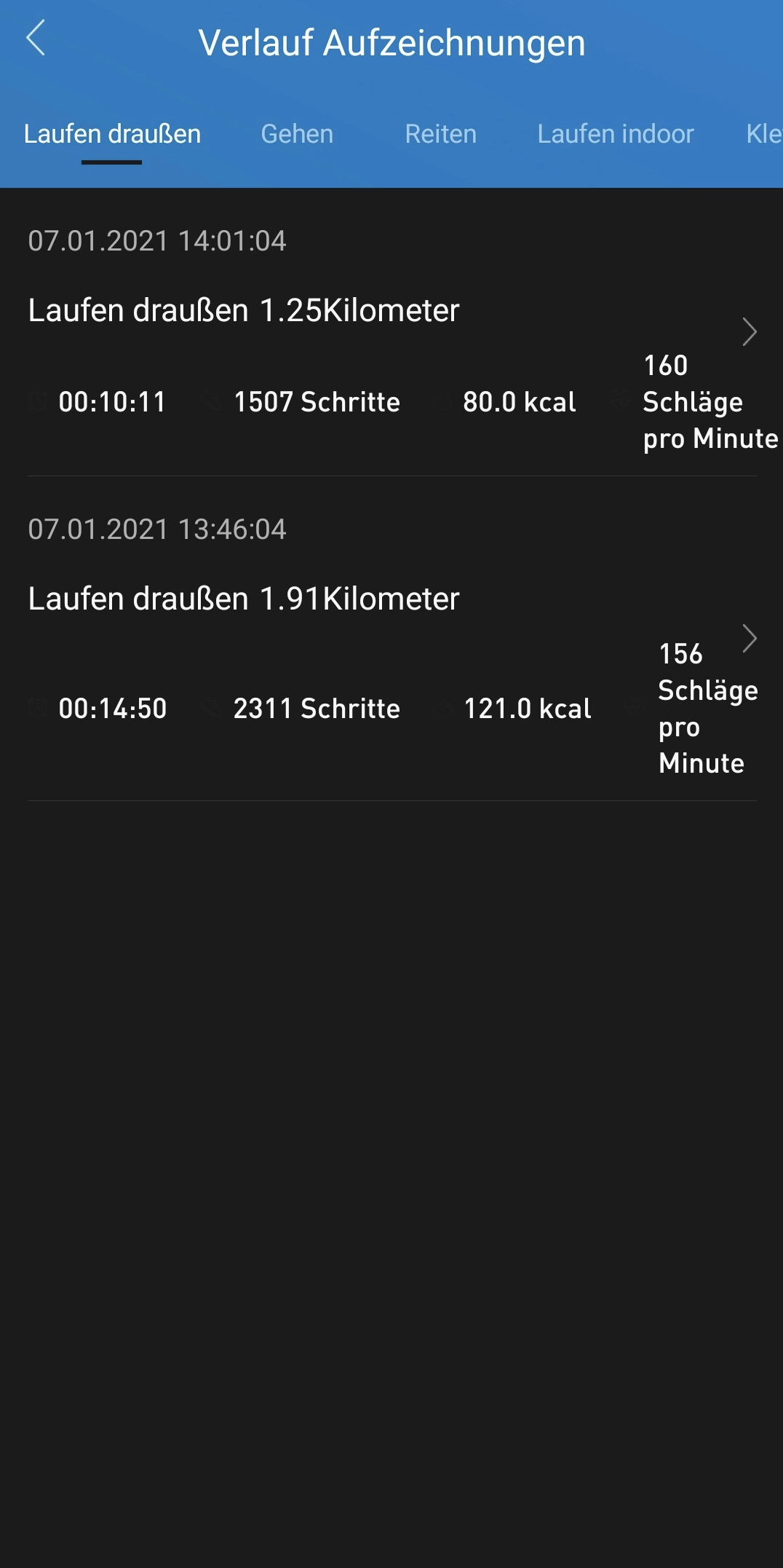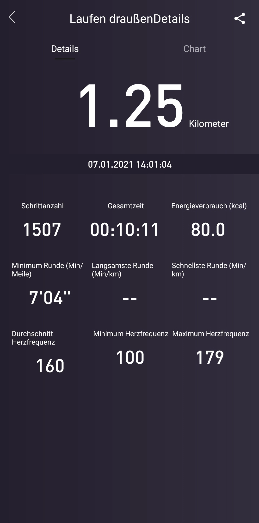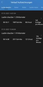 Über die Anzeige der monatlichen Gesamtkilometer gelangt man auch zu detaillierten Übersichten der jeweiligen Trainingseinheiten mit Gesamtkilometer, Schrittanzahl, Gesamtzeit, Energieverbrauch, die Durchschnittsgeschwindigkeit, durchschnittliche sowie niedrigste und höchste Herzfrequenz. Leider kann man diese Zusammenfassung nur über die App und nicht über die Smartwatch abrufen. Dennoch enthält die Übersicht alles, was eine Running oder Tracking- App in der Standardversion anbietet.