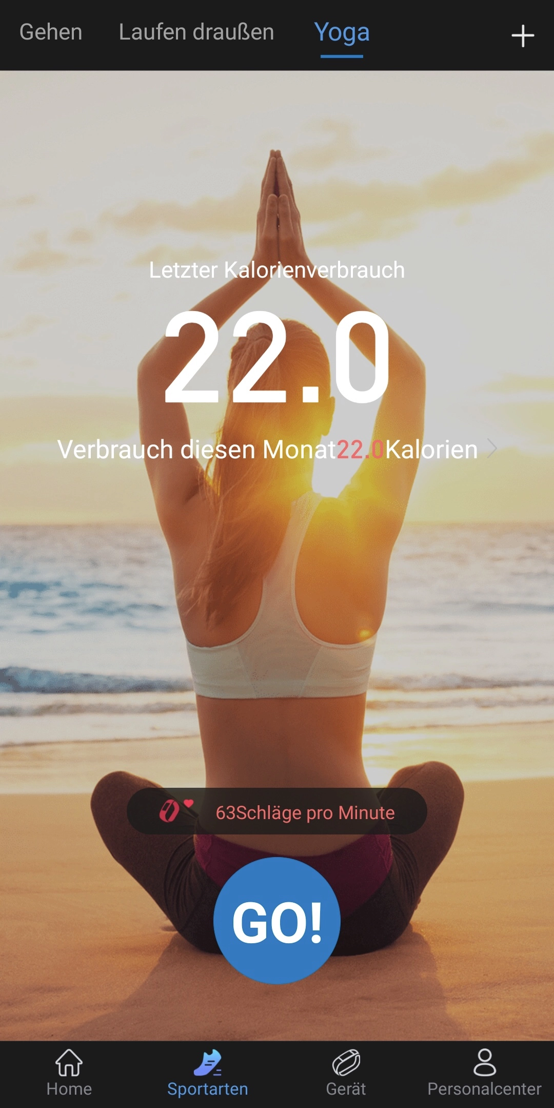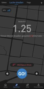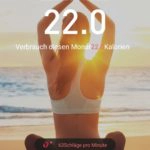 Da die beiden Sportarten die Funktionen und Möglichkeiten gleich sind und nur des Hintergrundbild unterschiedlich ist, fasse ich beide zusammen. Wie bereits beim Laufen (draußen) wird in der Übersicht in der App der letzte Verbrauch und Gesamtverbrauch im Monat angezeigt. Bei beiden Sportarten wird der Kalorienverbrauch angezeigt und nicht die zurückgelegte Wegstrecke, was aus meiner Sicht aber auch Sinn ergibt. Auch hier wird wieder die live ermittelte Zahl der Herzschläge pro Minute angezeigt. Anders als bei „Laufen (draußen)“ kann hier allerdings kein Ziel festgelegt werden. Die Ermittlung des Kalorienverbrauchs erfolgt automatisch anhand der Dauer des Trainings. Deshalb steigt auch der Verbrauch konstant weiter, obwohl man sich gar nicht bewegt.