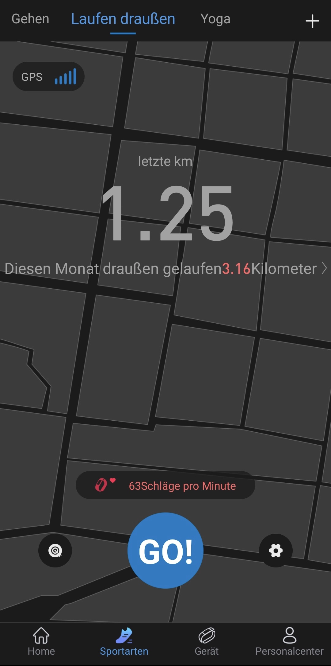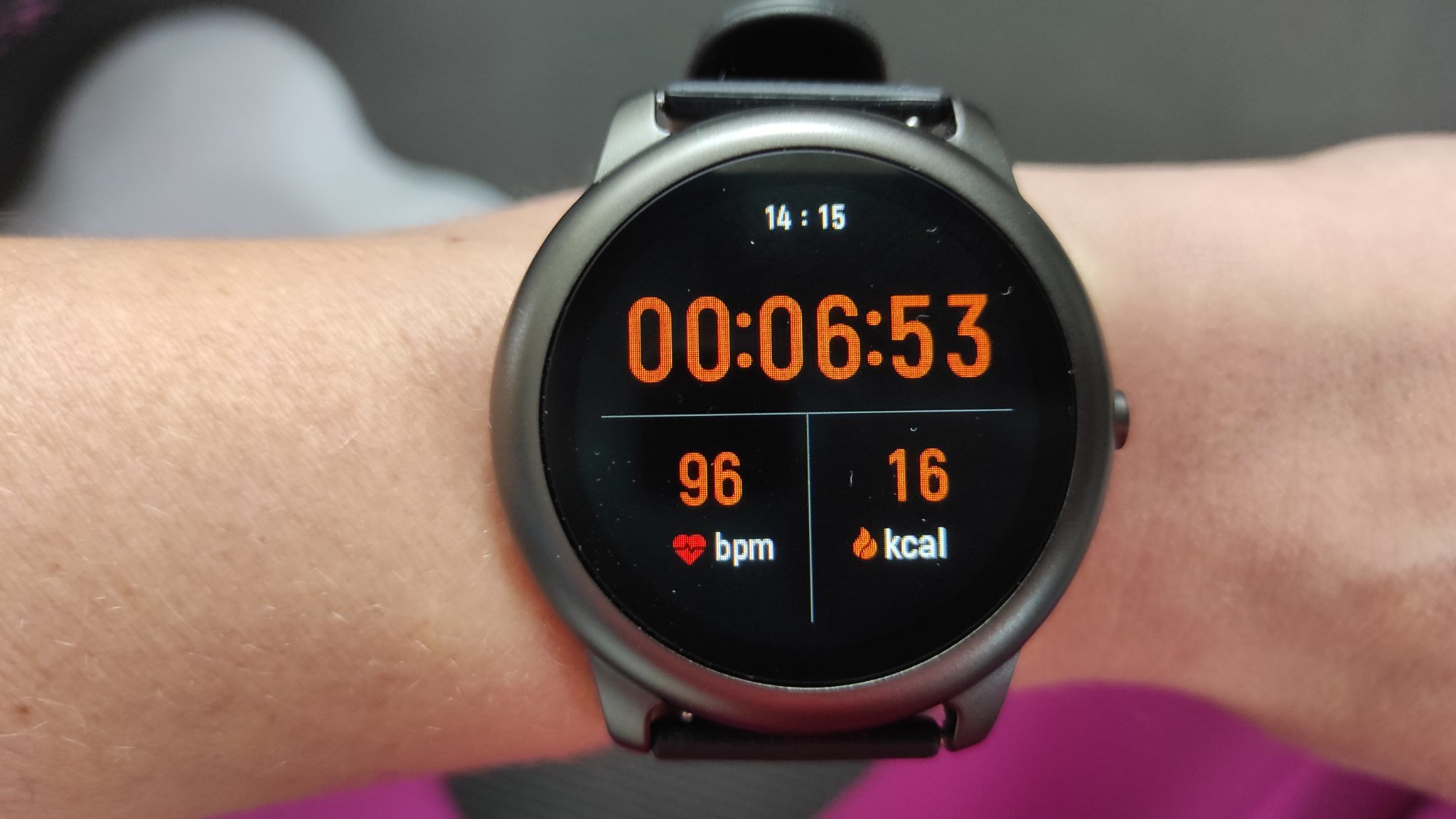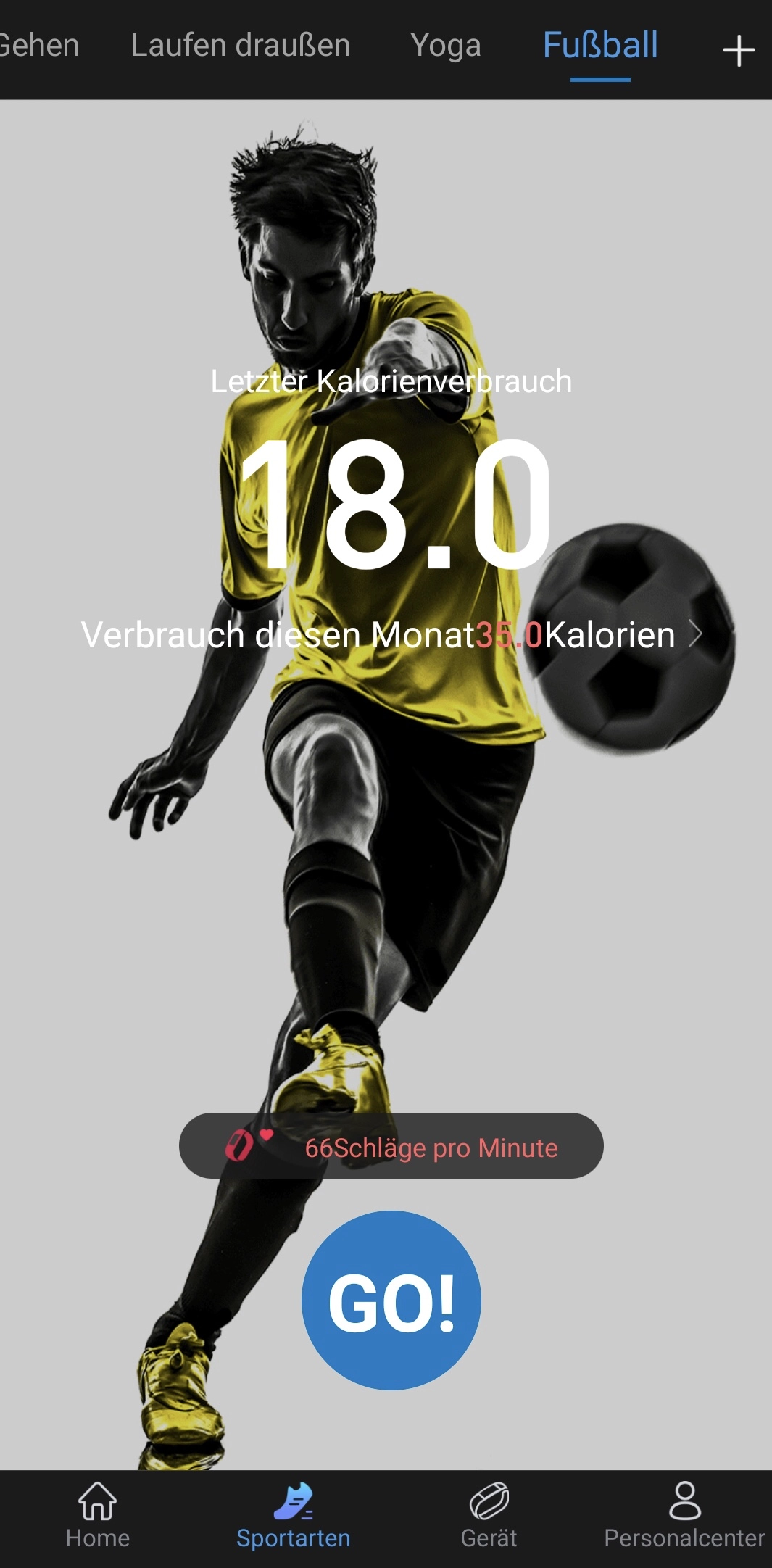 Zur Auswahl stehen 12 Sportmodi in vordefinierter Reihenfolge. Erreicht werden können diese in der Smartwatch nur über das Hauptmenü. Von mir getestet wurden die Modi Laufen (draußen), Yoga und Fußball. Soviel vorweg: das Tracking-Menü der verschiedenen Sportarten sieht immer identisch aus und zeigt neben der Dauer, den aktuellen Puls und die aktuell verbrannten Kalorien an.